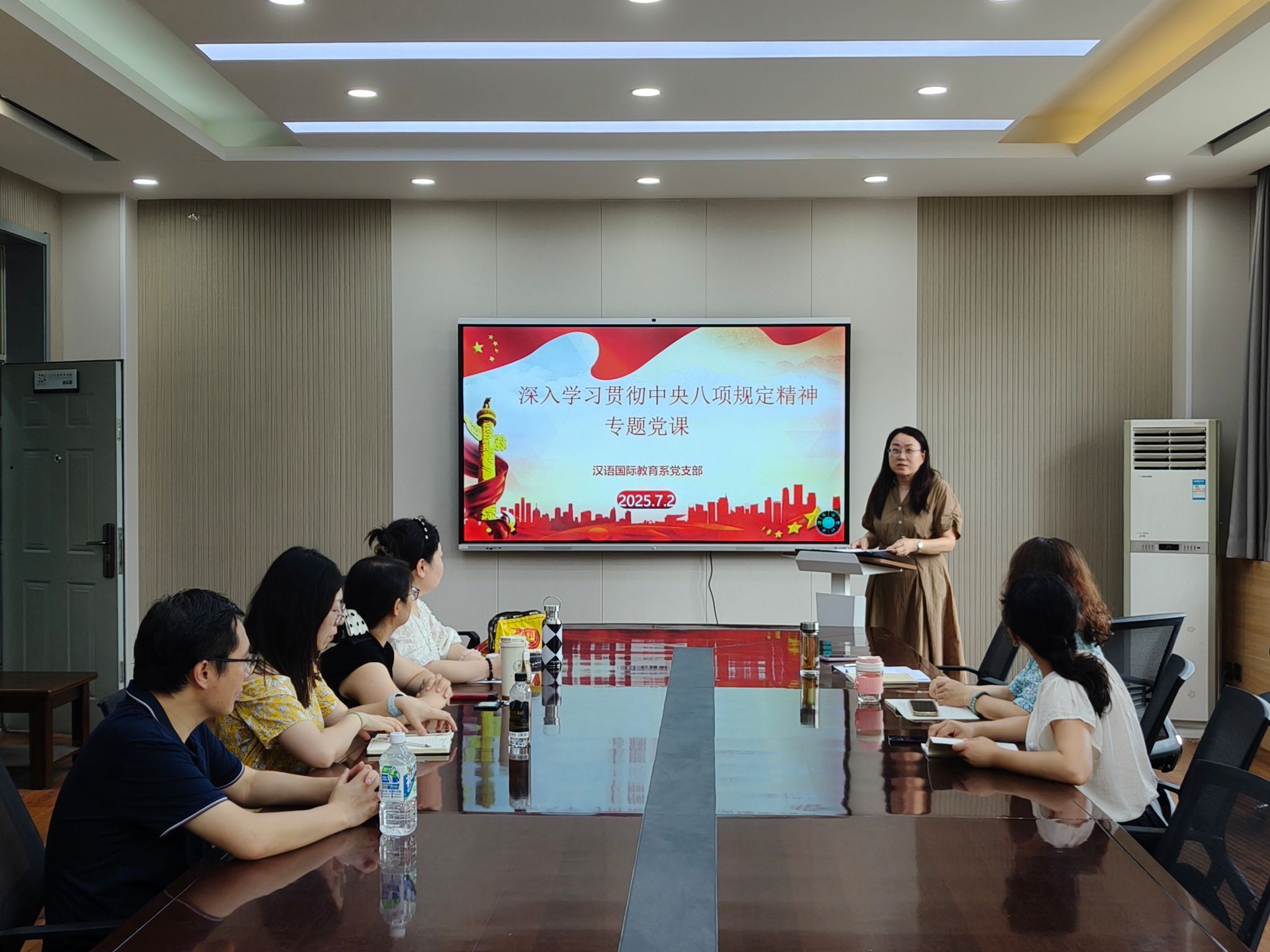 为深入贯彻落实新时代教师队伍建设要求,强化高校教师思想政治素养与职业操守,9月19日,汉语国际教育系党支部组织开展“修师德、树师风,践行教育家精神”专题学习活动,全体党员教师参会并展开深入研讨。活动伊始,党支部书记胡燕同志带领全体党员教师重温《高校教师行为准则十条》,围绕“坚定政治方向、自觉爱国守法、传播优秀文化、潜心教书育人、关心爱护学生、坚持言行雅正、遵守学术规范、秉持公平诚信、坚守廉洁自律、...