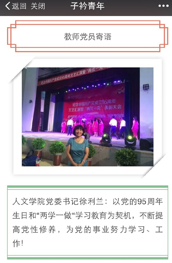 7月1日,人文学院党委组织开展了“青春凝聚党旗下,师生寄语建党节”主题活动,师生党员们的祝福寄 语在我院学生工作微信公众号《子衿青年》上刊登。