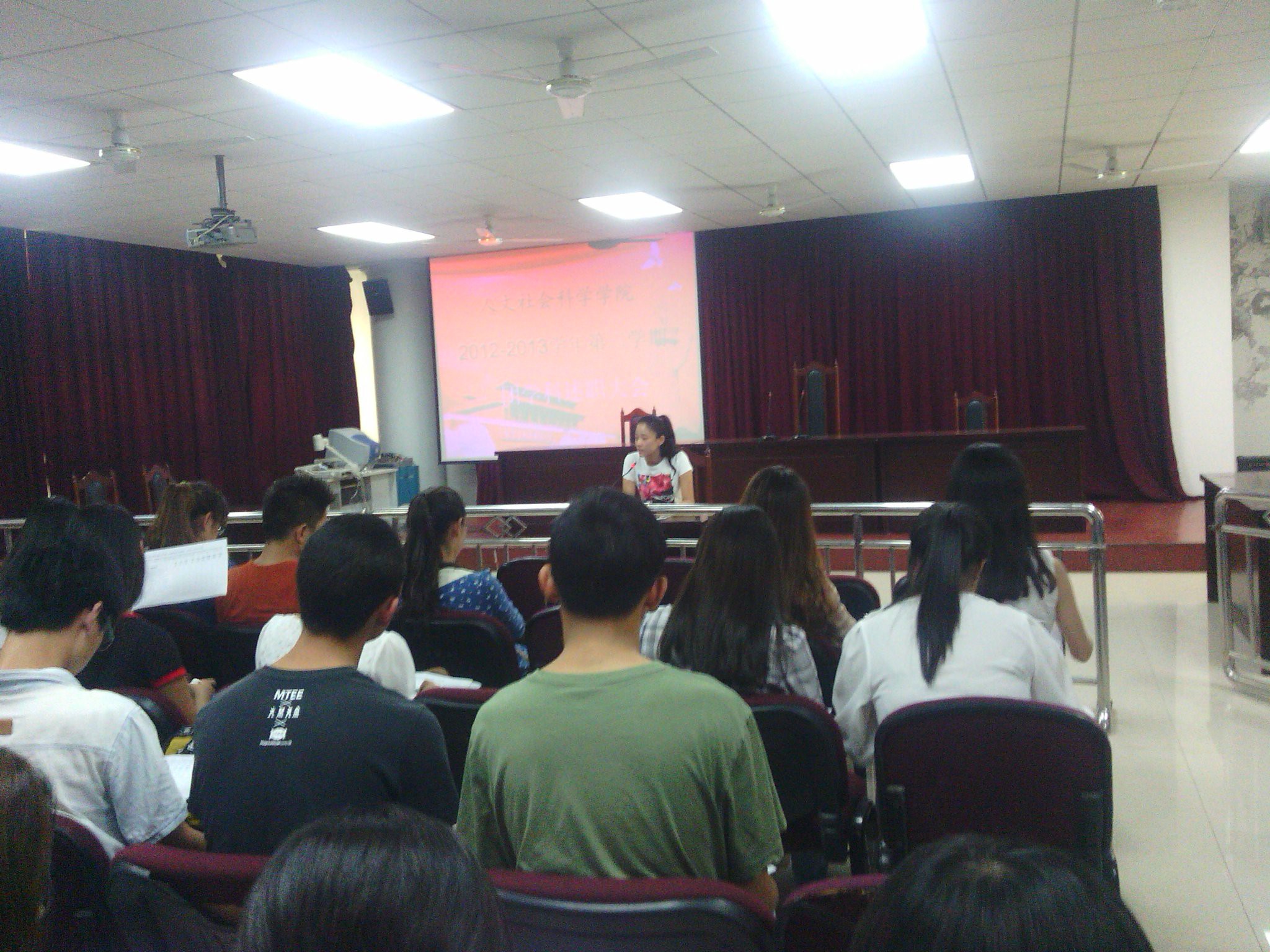 2013年9月4日,人文学院在人文楼模拟法庭召开了“人文学院2012—2013学年第二学期团学科及社团述职大会”,人文学院党总支副书记付刚、团总支书记周晓惠、团学科及各社团负责人和全体学生干部参加了本次大会。