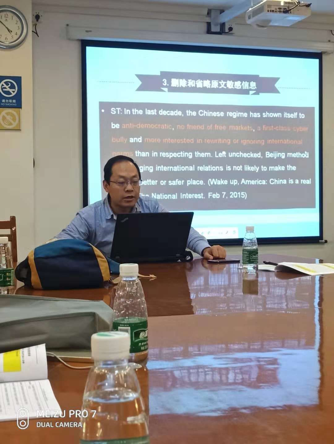 11月17日下午,胡伟华院长主持了第二分会场报告并做了题为“国际新闻编译中的译者主体意识及语言操控”的报告。报告主要探讨了新闻编译者在新闻编译过程中,如何对源文本进行改写和语言操控,以维护和扩大所代表国家的国际形象。同时,报告还从编译概念创生与发展探讨了新闻编译中译者现身与主体性发挥、主体意识彰显等问题,并以详实的案例分析了新闻编译的特点与策略,引起了与会学者的关注。