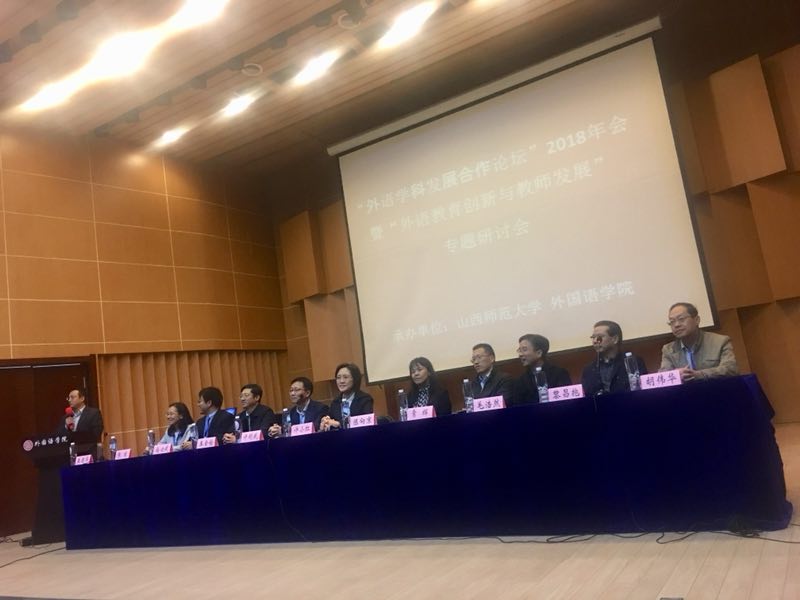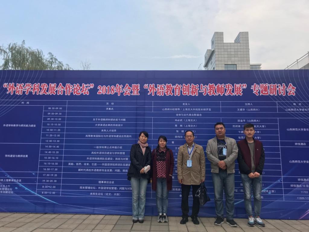 10月12-14日,“外语学科发展合作论坛”2018年会在山西省临汾市举办,由山西师范大学外国语学院承办。我院院长胡伟华教授带领大学英语二部主任郑卉荣副教授、翻译硕士教学中心常务副主任刘秉栋博士、科研秘书荆洁兰老师以及2018级本科生计海顺同学参加论坛,并做了题为“高等教育国际化与外语学科发展应然路向”的主旨报告。