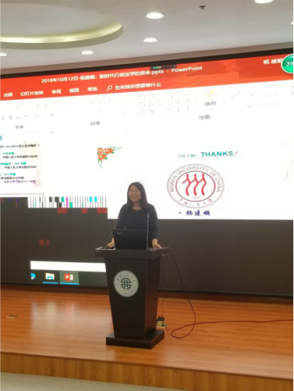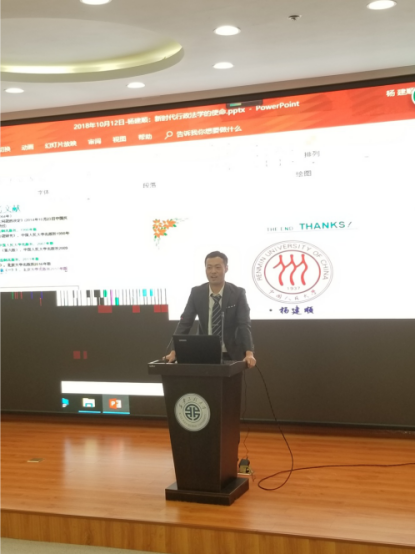 10月12日下午,应人文学院邀请,中国人民大学法学院杨建顺教授做客我校,在临潼校区图书馆一楼报告厅做了题为“新时代行政法学的使命 ”的学术报告。人文学院副院长何芳、院长助理孙迪、法学学科带头人张宝亚、法律硕士教学中心主任张笑天、法学系主任金邦庆、中国人民大学博士封蔚然及我院师生聆听了报告。报告会由何芳主持。