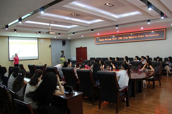 Cara首先进行了自我介绍,并对恩波利亚州立大学的基本情况作了简介。随后重点介绍了恩波利亚州立大学的TESOL教育及相关课程安排,强调了实践的重要性。最后,Cara就中美英语教学的差异等问题与在场师生进行了热烈的讨论。