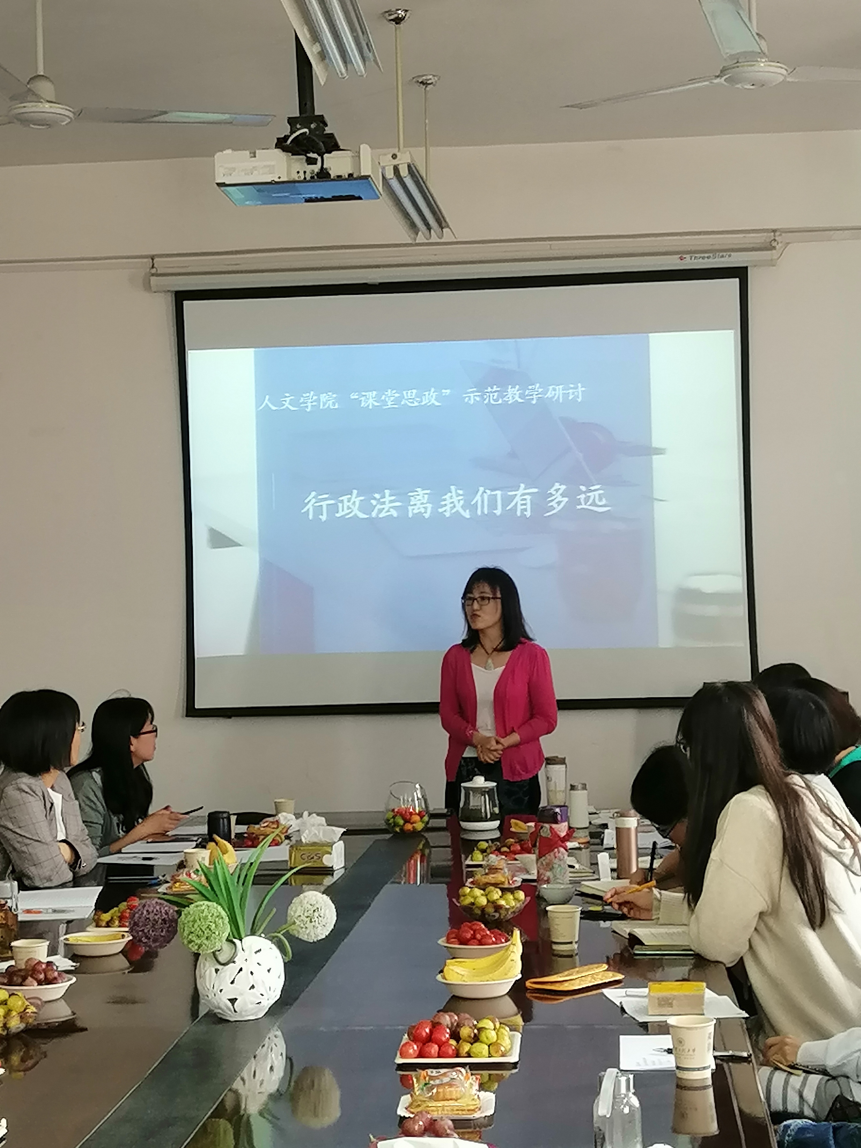 接着,全体老师观摩了“课程思政”示范课程教学。张笑天老师主讲的“行政法离我们有多远”,通过讲述在疫情期间,多个国家由于行政法不同体现出抗疫效果不同,表示行政离我们很近,行政在我们生活当中。陈曦老师主讲的“桃夭”,通过对中国古诗《桃夭》的欣赏,讲述穿越两千年时空的审美。两位老师从教学内容和方法上注重思想理论教育和价值引领,将社会主义核心价值观教育很巧妙地融入了课堂之中,给大家起到了很好的示范和启发。
