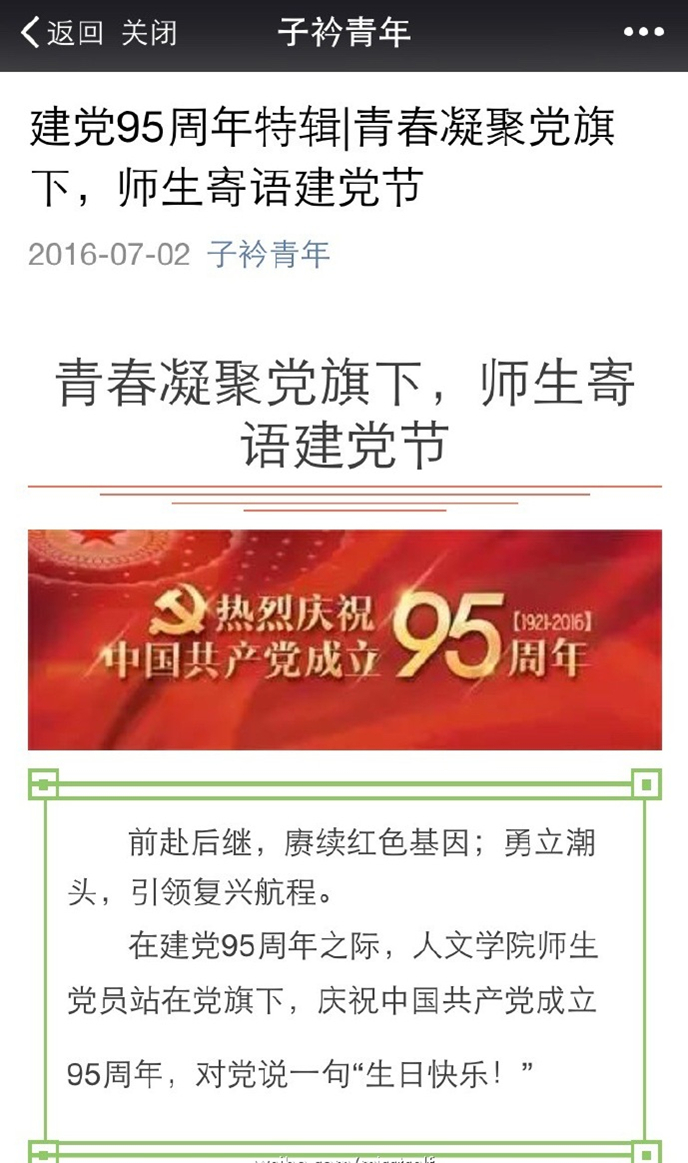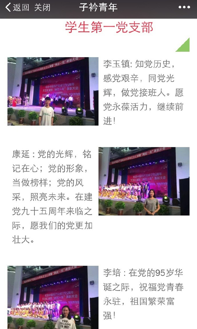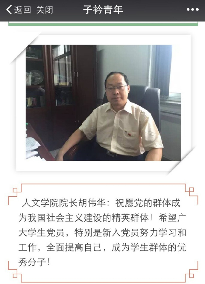 语在我院学生工作微信公众号《子衿青年》上刊登。人文学院党委书记徐利兰、院长胡伟华、学生党支部书记以