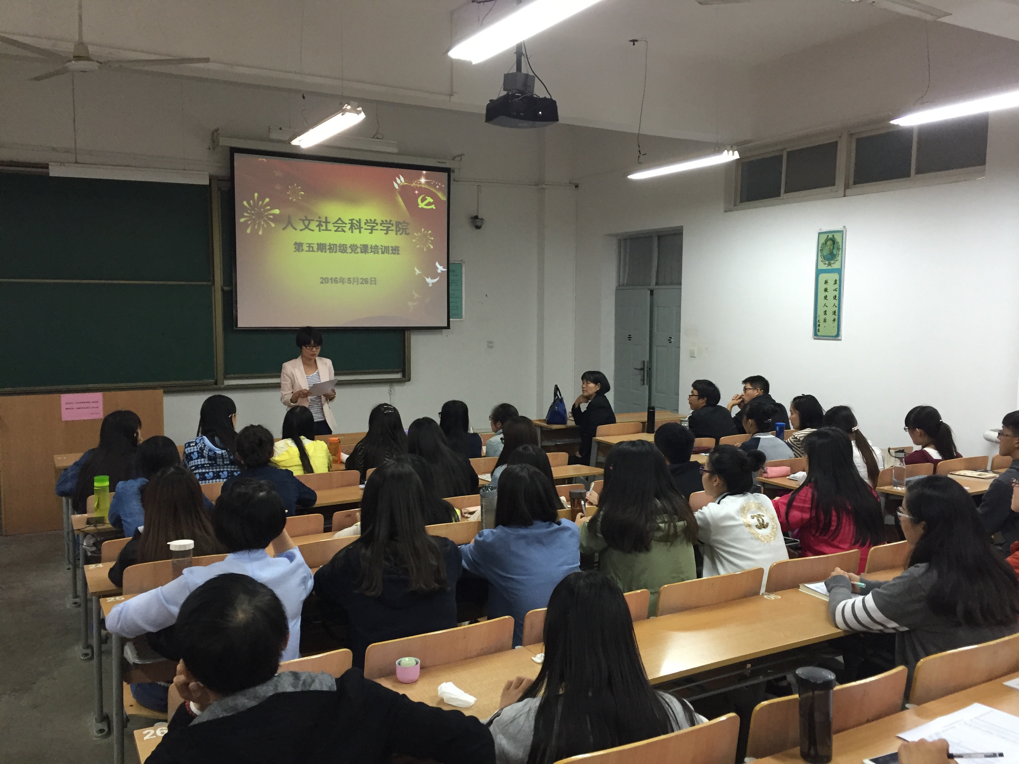5月26日晚,为深入贯彻党的十八大和十八届四中、五中全会精神,学习习近平总书记系列重要讲话精神,落实好党中央“两学一做”实施方案,进一步加深对党的性质、纲领、任务、奋斗目标及党员权利和义务的认识与理解,端正入党动机。根据人文学院党委2016年党校工作计划部署安排,人文学院第五期初级党课培训班在我校临潼校区教学楼A-308正式开班。人文学院党委书记徐利兰、学工办主任刘婷婷及13级、14级共52名入党积极分子到场参加开班典礼。开班典礼由学工办主任刘婷婷主持。