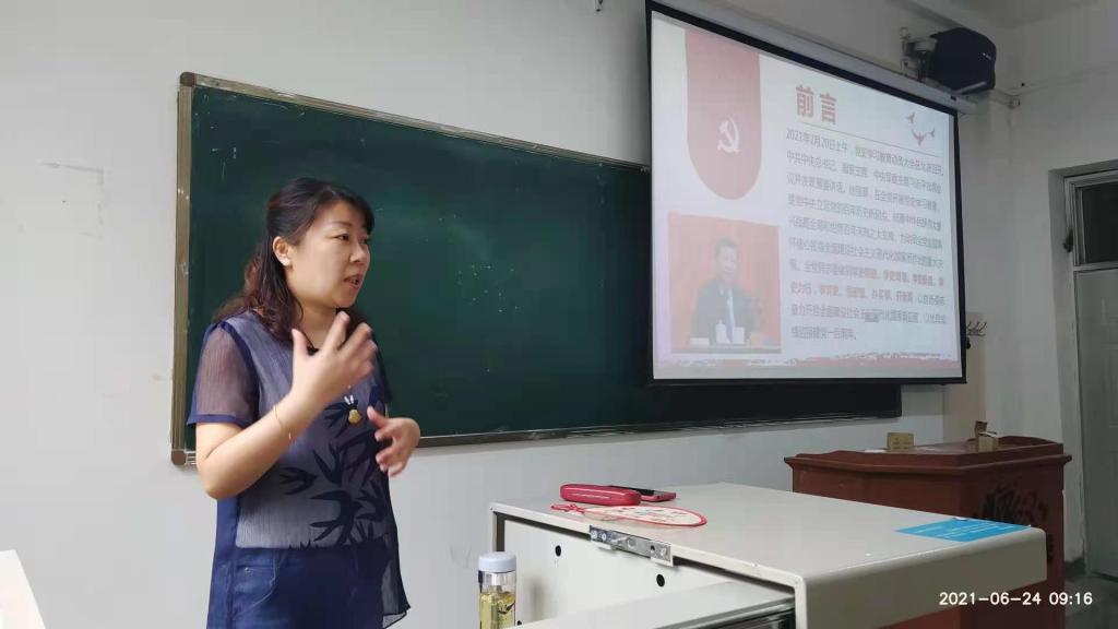 首先,大学英语教学部党支部书记郑卉荣老师围绕党史学习教育,从“为什么学”“学什么”和“怎么学”三个方面进行党课讲授。