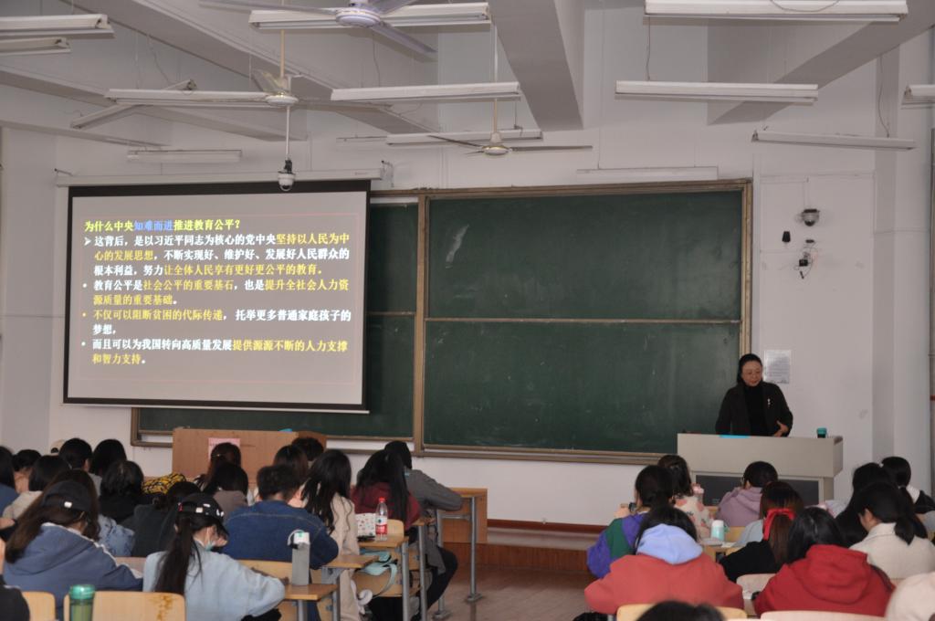本次党课第二讲由惠亚玲讲授,以“从我国教育公平政策谈个人职业规划”为主题,主要从三个方面进行讲述:一是结合李克强总理关于教育公平的谈话,阐述了教育公平的含义以及教育公平的三个层次,让学生认识到教育是国之大计、党之大计,在以习近平同志为核心的党中央的领导下,我国教育普及水平实现了历史性跨越;二是通过中美教育制度对比,论证了中国教育制度的利与弊,开阔了学生们的视野,从宏观角度来考虑中国教育制度的合理性;三是大学生个人职业发展规划,惠亚玲列举了生活当中的真实事例,来论证现代教育的重要性,并给学生们提出个人职业规划的建议。