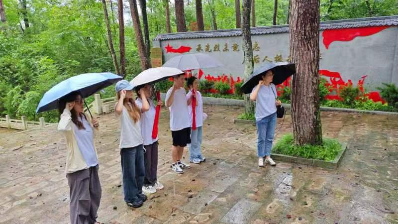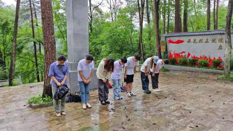 7月15日,支部师生前往镇安县米粮寺村革命烈士墓园,缅怀革命先烈。墓园内的“燕子岩”外形宛若无畏风雨冲向云端的燕子,寓意着革命先烈们英勇无畏、勇往直前的精神。米粮寺村村干部详细地为师生们追忆了烈士墓园中革命先烈们的英勇事迹;在烈士墓碑前,党支部书记刘晓平带领研究生党员重温了入党誓词,后正冠鞠躬默哀。正值细雨绵绵,雨滴拂过脸颊,浸润衣衫,四周唯有雨珠击打树叶的沙沙声。这一刻的肃穆,让研究生党员深刻感受到和平的珍贵,更是激发了研究生党员内心深处的信念和决心——继承先烈未竟遗志,激励后人振兴中华。
