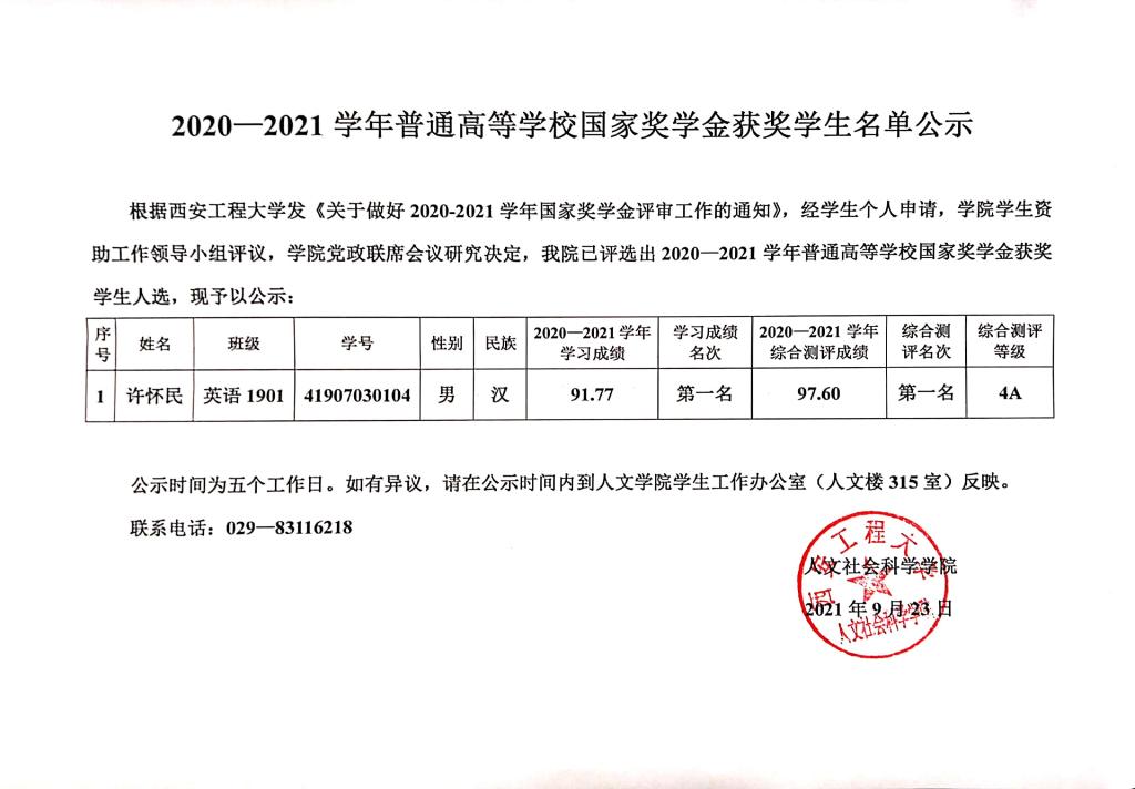 2020—2021学年普通高等学校国家奖学金获奖学生名单公示