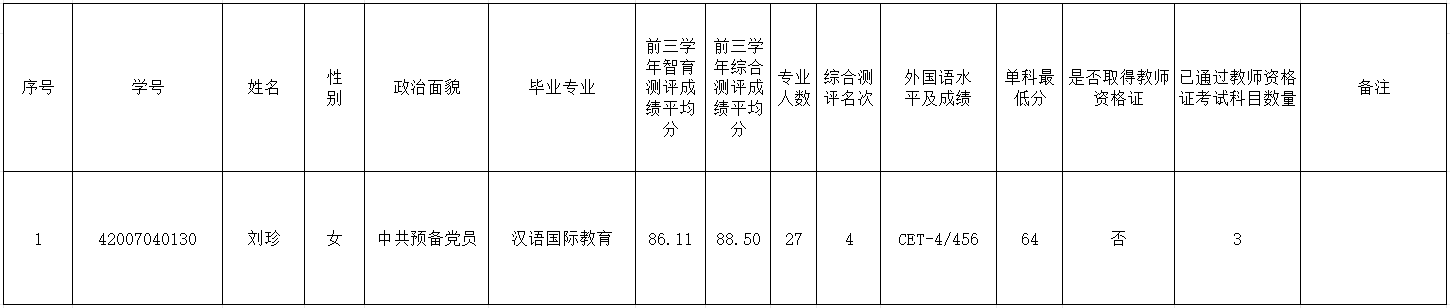 经学生本人申请,学院推免工作领导小组评议,学院党政联席会议研究决定,我院拟推荐刘珍参加米兰中国第26届研究生支教团选拔,现将拟推荐人选予以公示,具体名单如下: