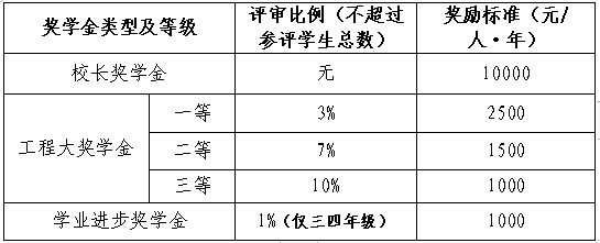 校内奖学金为了充分激励广大学生勤于学习、善于思考、勇于创新,培养德智体美劳全面发展的社会主义建设者和接班人而设立的,分为校长奖学金金、工程大奖学金和学业进步奖学金三种类型,具体奖励标准和比例如下表: