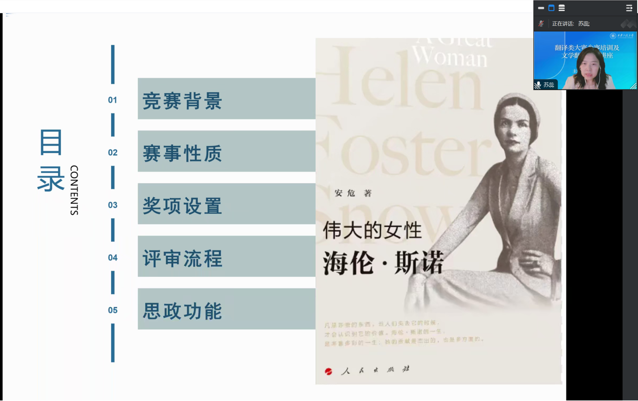 苏蕊教授以“海伦·斯诺翻译大赛”备赛为主题,详细介绍了大赛历史背景、竞赛特点、奖项设置及评审环节。同时,结合自己丰富的翻译、译审经验针对本次大赛重要知识背景信息进行了深入讲解和分析,为师生们提供了宝贵的建议和指导。苏教授强调,海伦·斯诺翻译大赛不同于一般技能型比赛,是一场对中国文化的深刻理解和表达,通过借鉴外国视角讲述中国故事的有效方式和经验,利于提升讲好中国故事的能力。