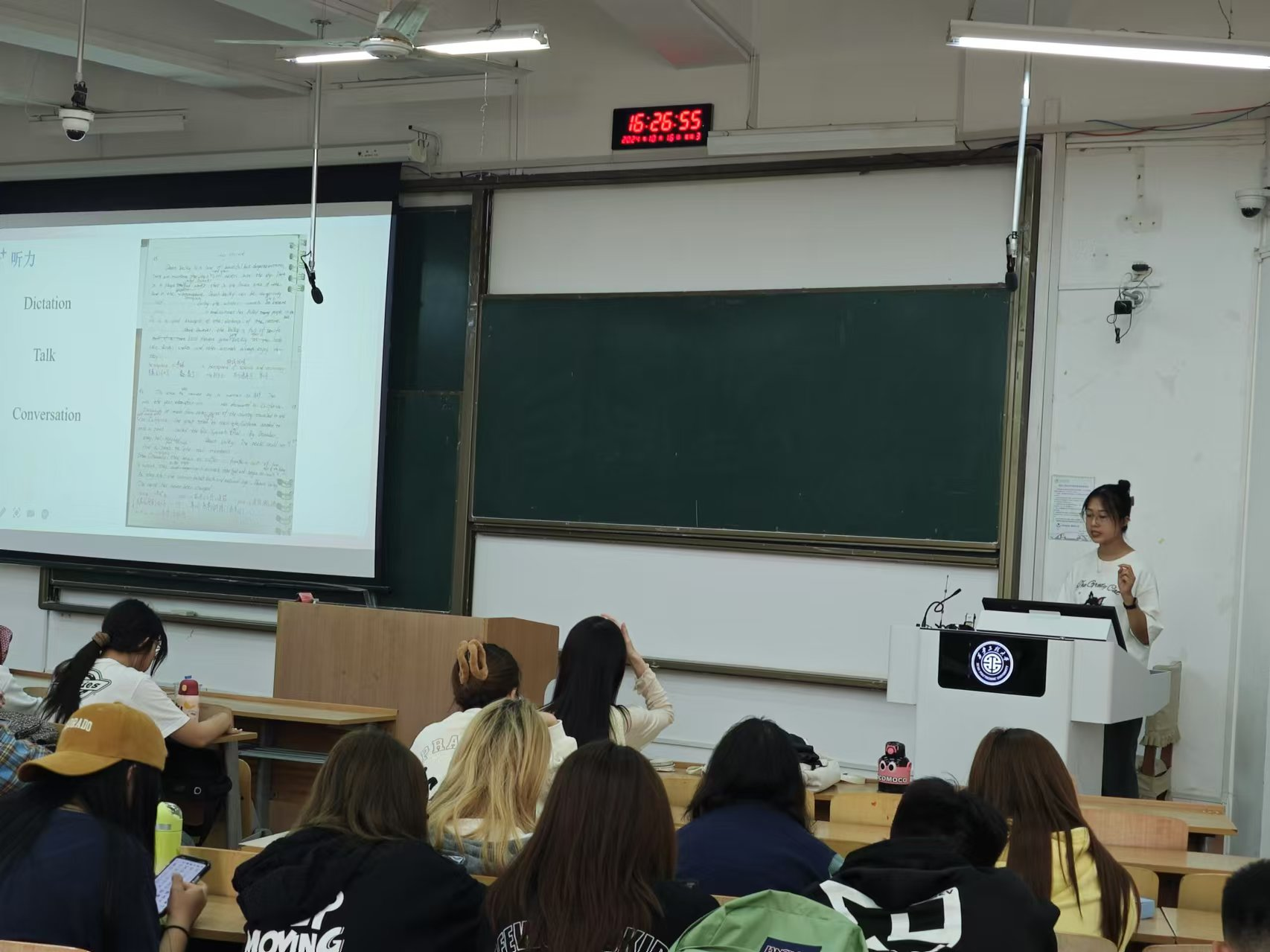 接着,王韶涵同学针对专四考试进行了深入剖析。她从专四考试单词、听力、阅读等方面,并结合自身的备考经历,推荐了一系列实用的学习资料和高效的学习方法。她特别提醒同学们要注重单词的积累和写作的训练,合理安排时间进行有针对性的复习。