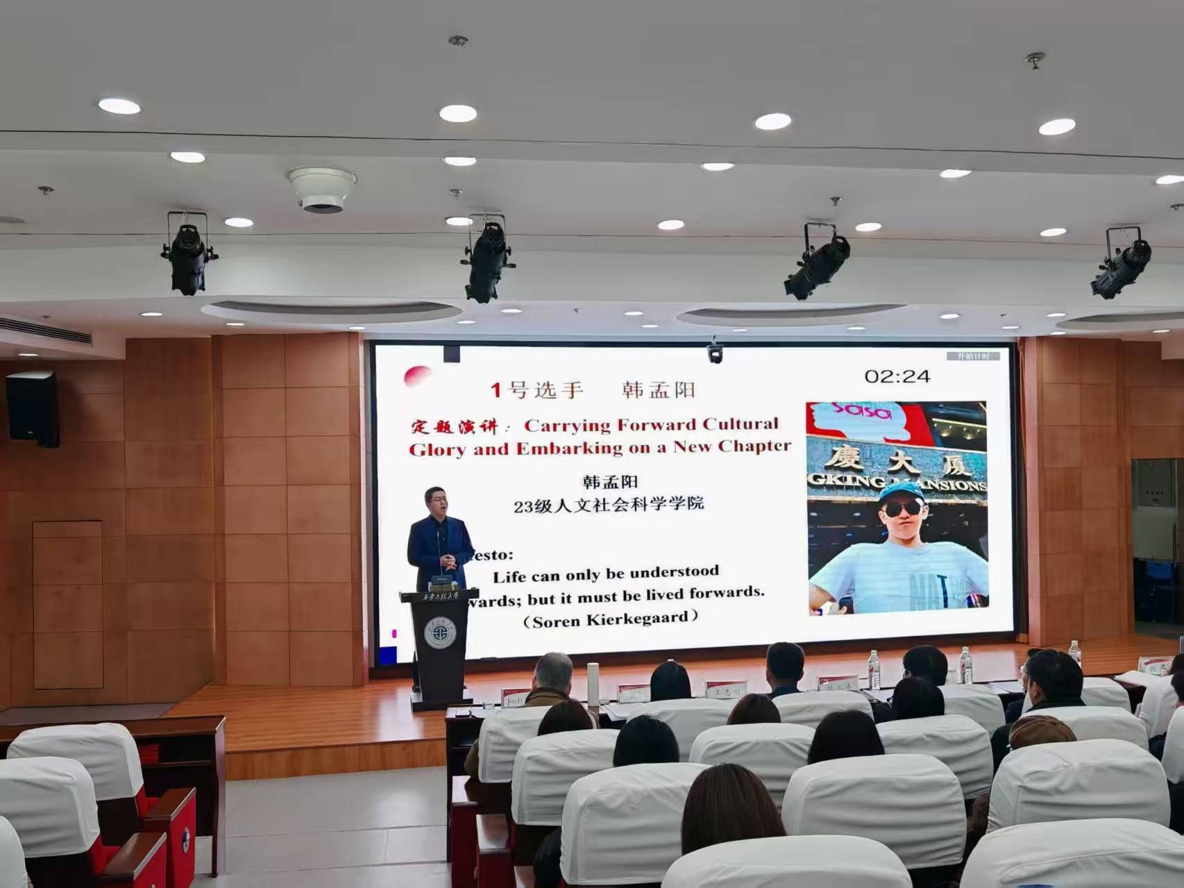 经过初赛、复赛的激烈竞争,最终全校各学院共计10名选手进入本场决赛,并围绕“Carrying Forward Cultural Glory and Embarking on a New Chapter”主题展开精彩的演讲。