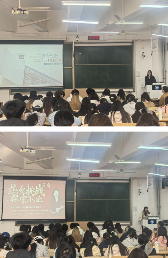 交流会邀请了在学科竞赛、专四备考及科创项目中表现突出的高年级学生代表:“外研社国才杯大赛”获奖同学陈晓文(省级笔译金奖、综合银奖)、隋静雯(省级综合银奖)、霍若木(省级口译铜奖),“外教社跨文化大赛”获奖同学陈晓文(省级金奖)、“iCan大赛”获得者瞿福榕(省级金奖),专四考试优秀学生邓雯、杨方妍、王悦,以及国家级大创项目负责人张晓瑜,为低年级同学分享实用经验。