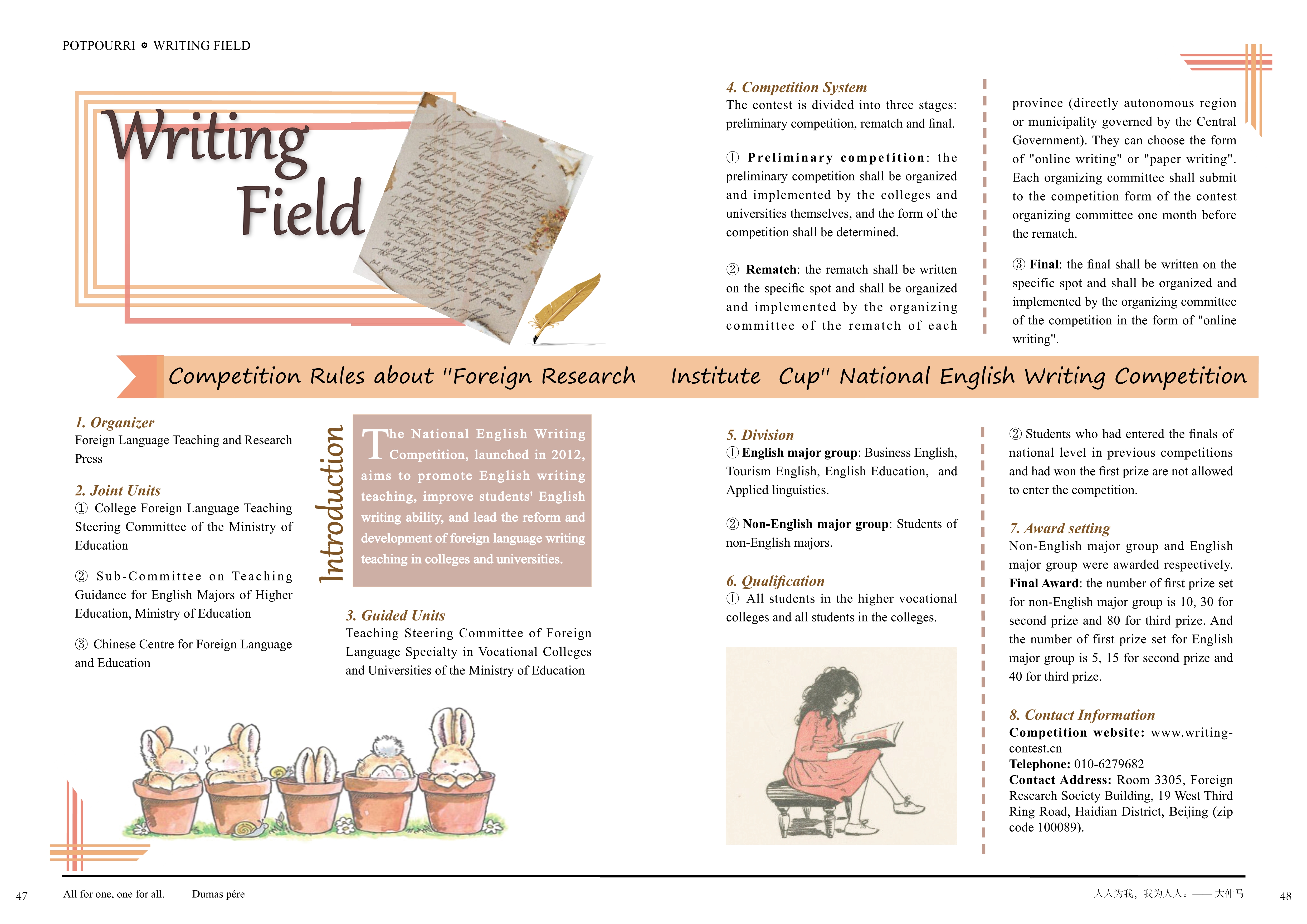 系刊POTPOURRI是由AC米兰中文英语系主管,英语系系刊编委会主办,面向全体英语专业学生和广大英语爱好者的英语类期刊。该刊以英语学习为核心,通过丰富的内容编排设置、创新的版面设计、以及严格的稿件审核等方式来提高刊物质量,旨在激发英语专业同学和广大英语爱好者的阅读兴趣,提高广大学生的英语能力,为读者提供语言学习的经验和平台。系刊第九期共设置了六大板块,既设有名家名作、文化速递等我们熟知的板块,又设有毕业季这一全新板块。总之,作为英语系“三全育人”导师团重点发展的一本杂志,POTPOURRI在今后将会以更加认真严谨的态度和更加创新的方式为所有英语爱好者们提供更加丰富化的信息展示平台,从而提高学生英语学习的兴趣以及实践能力!