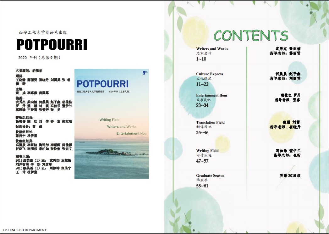 2020年9月21日,人文学院英语系系刊POTPOURRI第九期顺利出刊。在英语系“三全育人”导师团的共同努力下,POTPOURRI在过去的每一期都不断改进,获得了学院师生的一致好评。