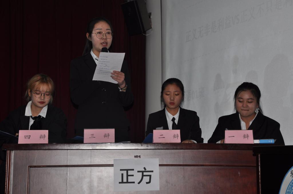 本次比赛共分为四场。前两场比赛由2019级英语专业代表队和2018级英语专业代表队围绕“正义无非是利益/正义不只是利益”、2019级汉语国际教育专业代表队和2018级汉汉语言专业代表队围绕“男生更应该被呵护/女生更应该被呵护”点燃烽火。两场比赛中双方辩手旁征博引、侃侃而谈,在自由辩论环节更是唇枪舌战、你来我往,双方激烈的攻辩赢得了台下观众的阵阵掌声。后两场比赛由2019级汉语言专业和2018级法学专业代表队围绕“宿舍之间该亲密有间/宿舍之间该亲密无间”、2019级法学专业代表队和2018级汉语国际教育专业代表队围绕“人要善于克制自己/人要善于表现自己”展开激烈角逐。正方辩手用充分而有力的论据向对方辩手证明己方观点,而反方辩手临危不乱、气势如虹,用缜密的逻辑思维据理力争。针尖对麦芒,双方各展其长,为台下观众带来了精彩纷呈的视听盛宴。