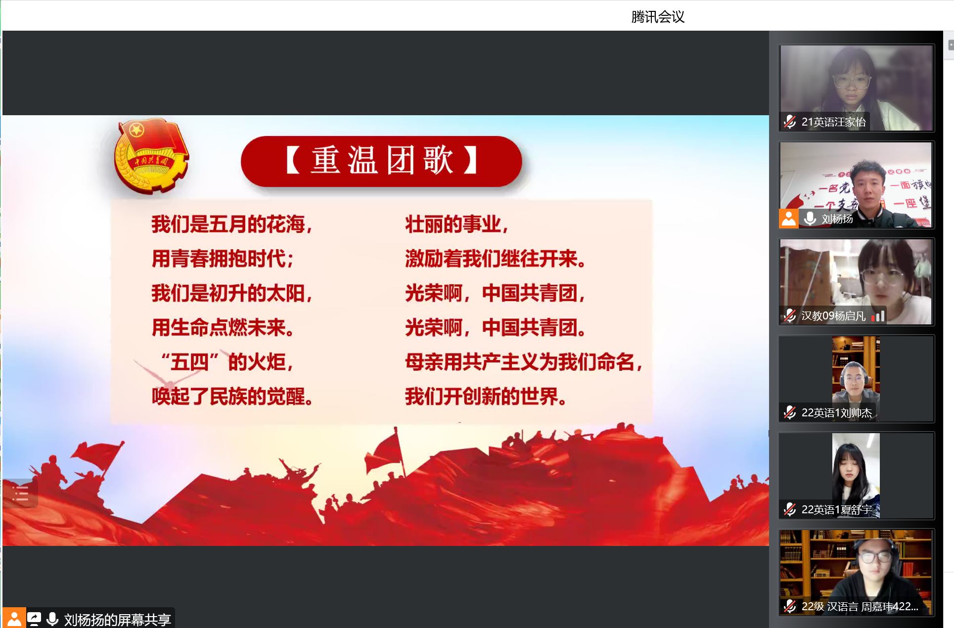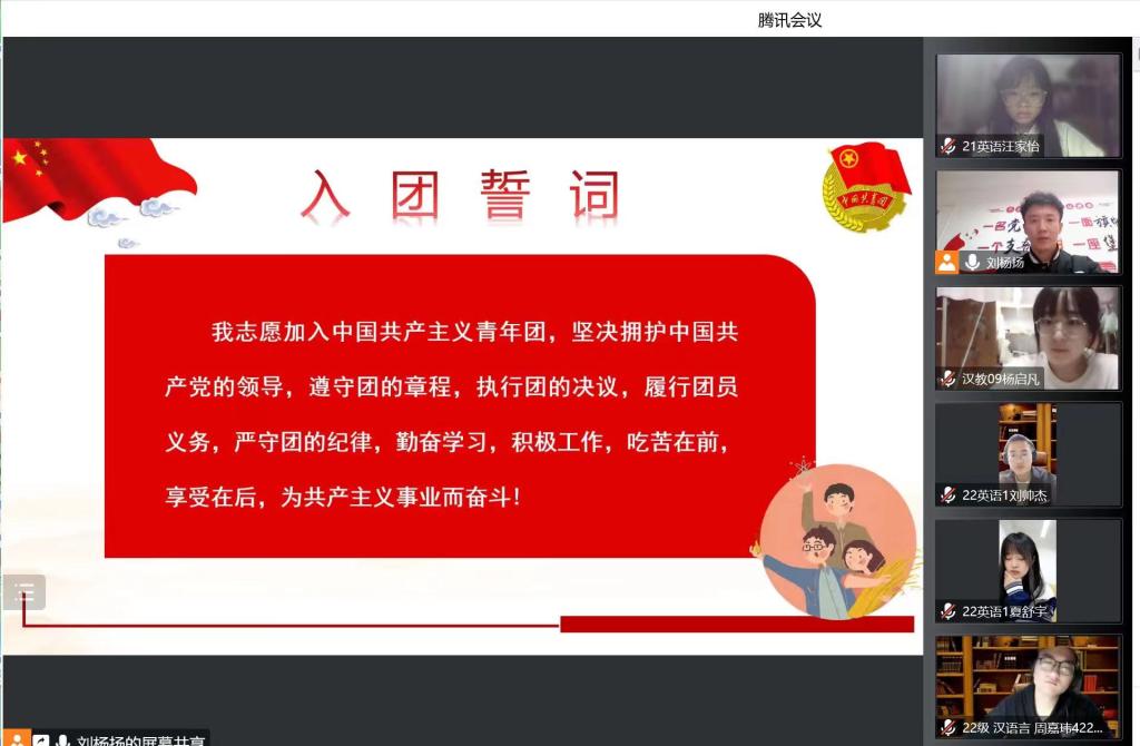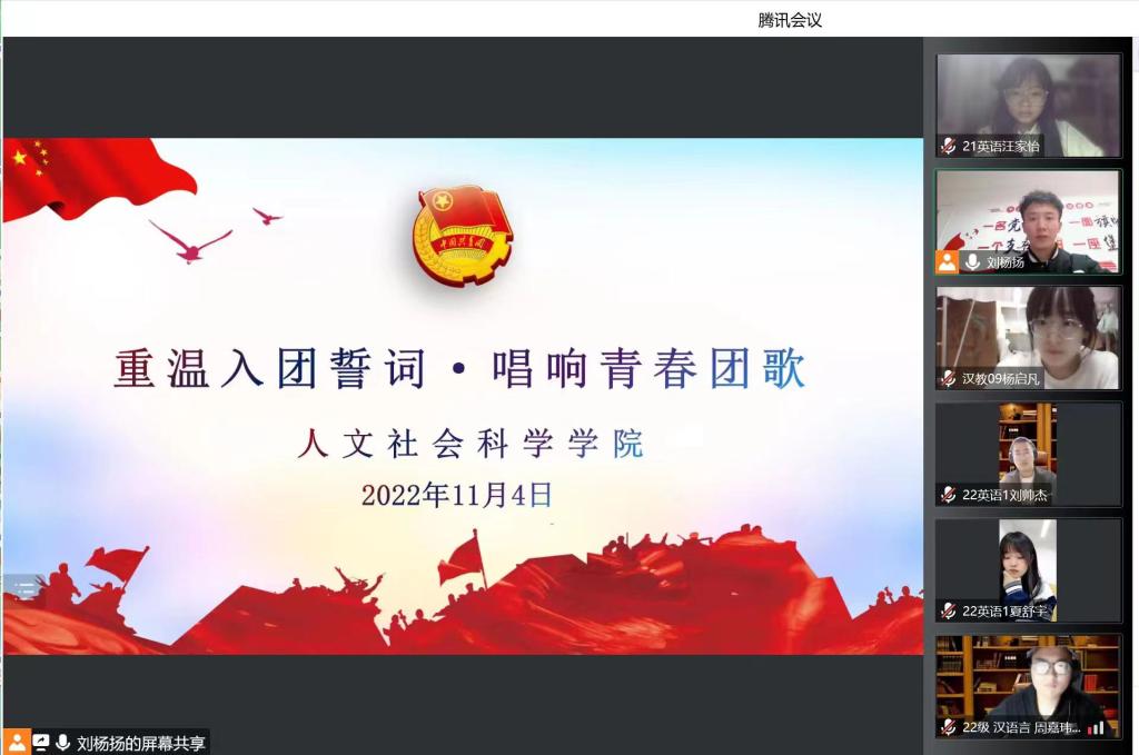 为进一步增强新生团员意识,强化新生团支部建设,夯实团的工作基础,人文学院团总支于11月4日举办了“重温入团誓词· 唱响青春团歌”活动。人文学院团总支书记刘杨扬及部分新生团员代表以线上会议的方式参加了此次活动。