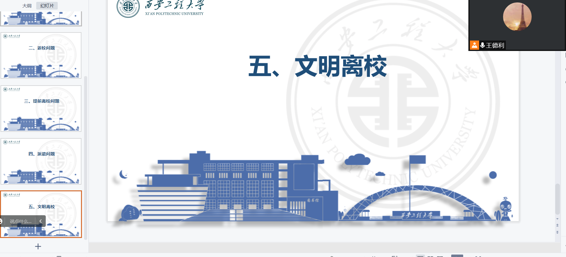 其次,针对毕业生比较关注的校外同学返校、提前离校问题、毕业生派遣、离校手续办理等问题一一做了详细说明,并重点就毕业生文明离校以及离校日程进行了安排,要求同学们杜绝不文明行为,做到文明离校,展示出有理想、有志气、有担当的新时代青年形象。