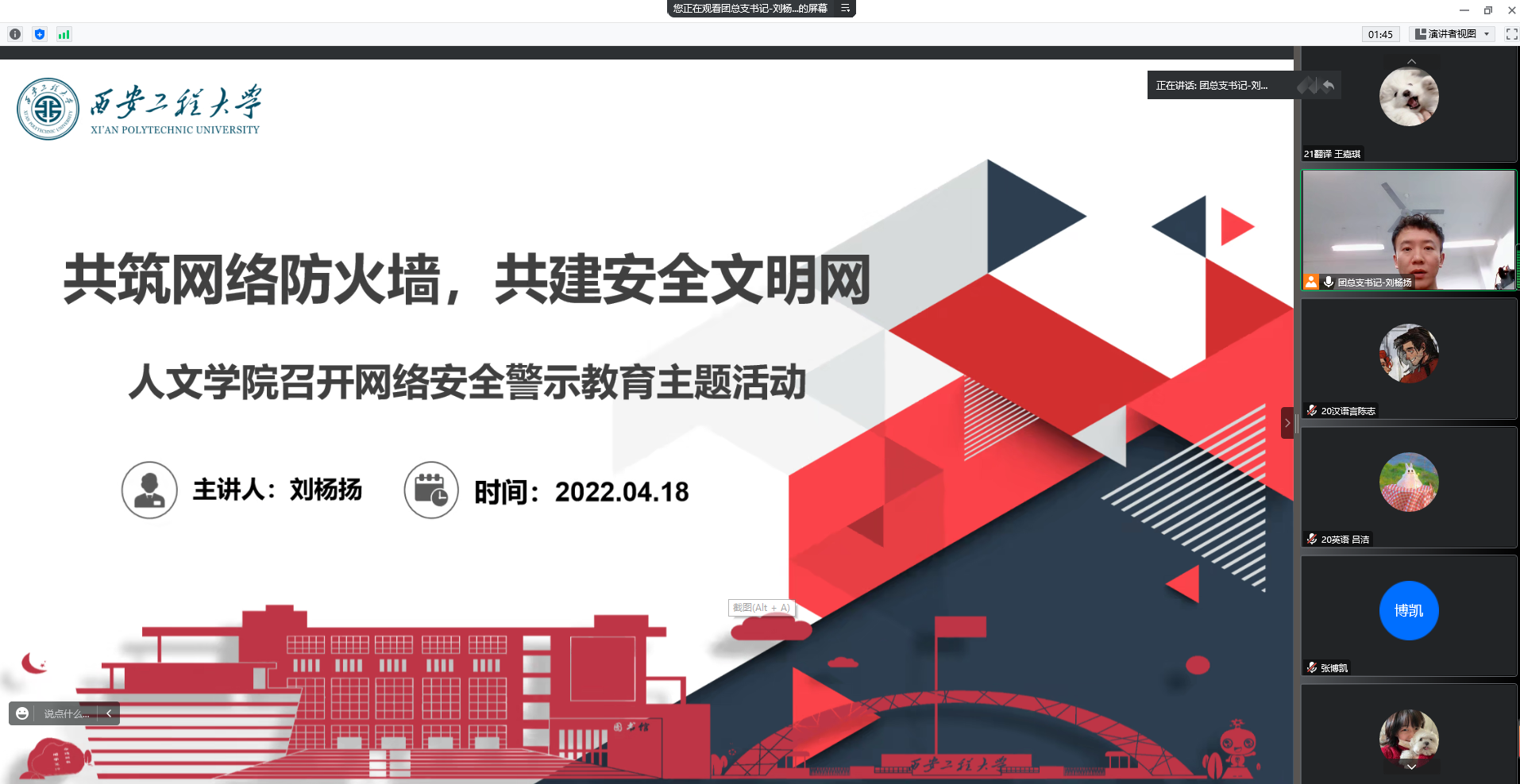 为树立网络安全意识,筑牢网络思想防线,4月18日,人文学院团总支书记刘杨扬带领各年级本科生代表召开了“网络安全警示教育”主题班会,各位同学在刘杨扬的带领下学习了网络安全的相关知识,加深了对网络安全的认识,提高了警惕意识。