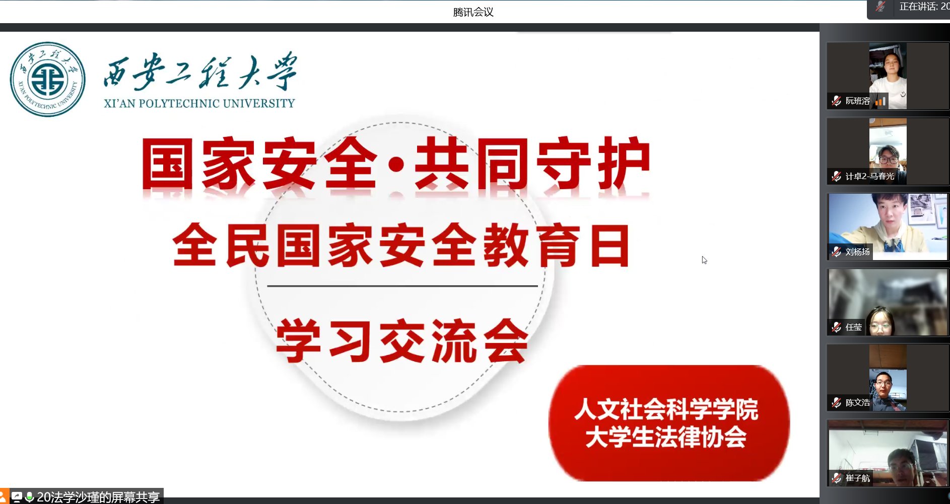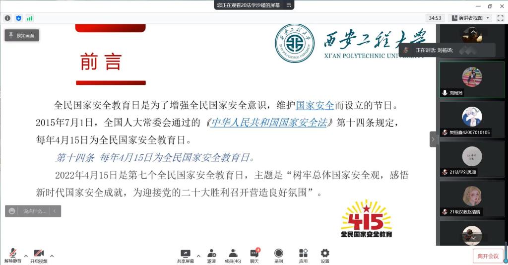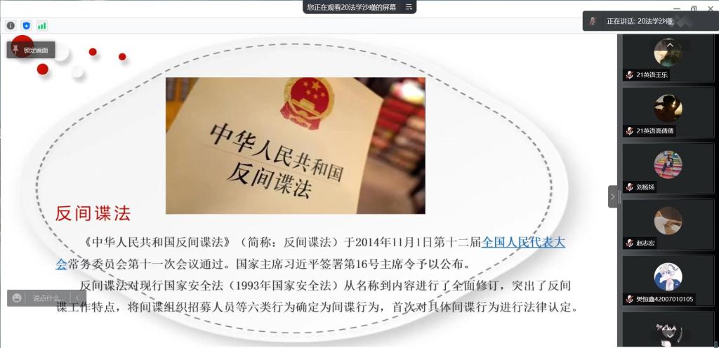 4月14日,在我国第七个全民国家安全教育日来临之际,为推动国家安全宣传教育工作深入开展,增强学生国家安全意识和法治意识,人文学院团总支与大学生法律协会共同组织开展了“国家安全·共同守护——全民国家安全教育日”线上学习交流活动,各班级学生代表参加了此次活动。