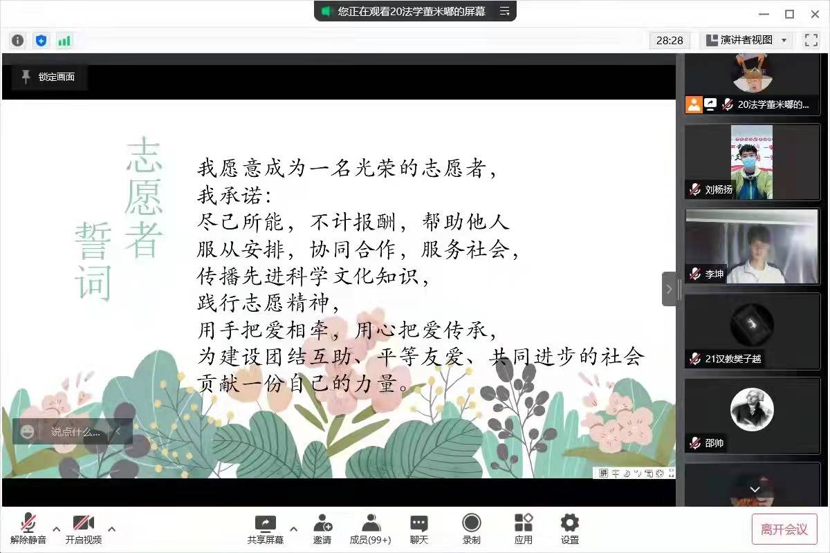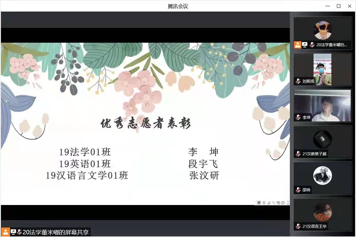 316日,人文学院在线上举办了青年志愿者入退会仪式暨表彰大会。人文学院团总支书记刘杨扬及学院全体青年志愿者参与了本次活动。