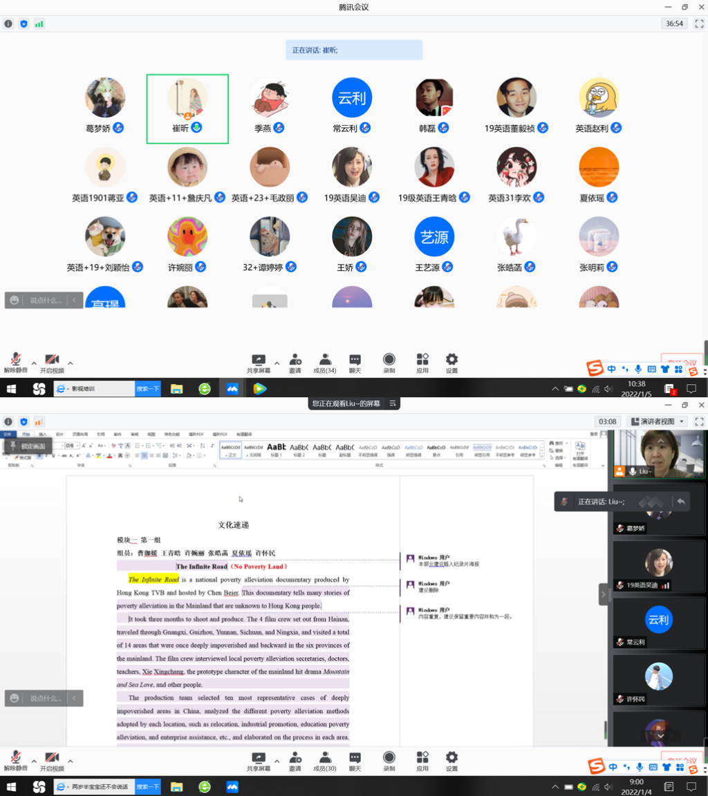 2022年1月4日至7日,人文学院英语系19级1班课程实习在线上平台圆满落幕。本次课程实习是英语系“三全育人”导师团重点工作之一,由导师团团长王晓静老师担任总指导老师,刘国英、张睿、崔昕、崔晓丹、薛丽贤老师分别担任各板块指导老师,英语19级1班全体学生共同参与。