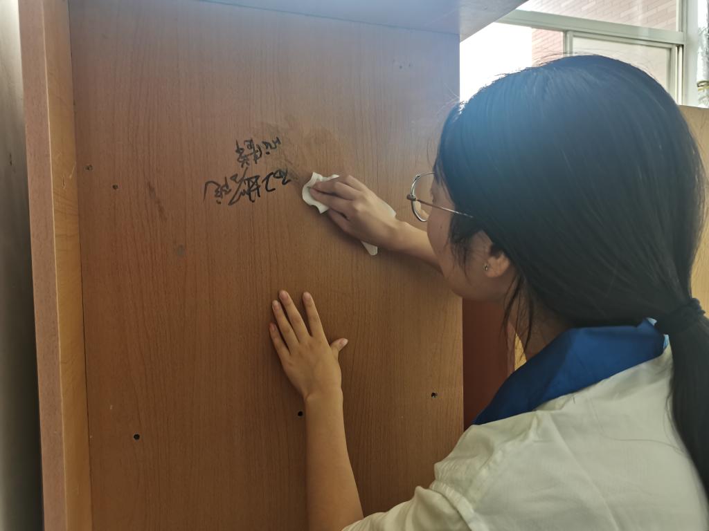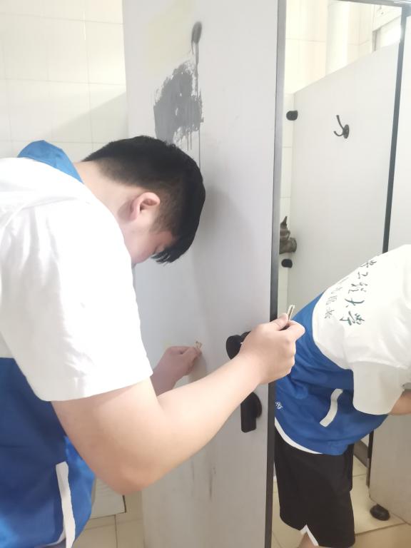 上午12时,活动伊始,各志愿者满怀热情,携带好工具统一在C栋教学楼大厅集合,由队长分发志愿马甲并说明具体工作安排。志愿者们被分为两组,各小组分工明确,统一从五楼由上至下开展清理工作。活动过程中,志愿者们穿梭在教学楼各个角落,于教室,卫生间门板等隐秘地带发现并认真着手清理涂鸦、印章、四六级、考研等小广告,活动有条不紊地进行着。