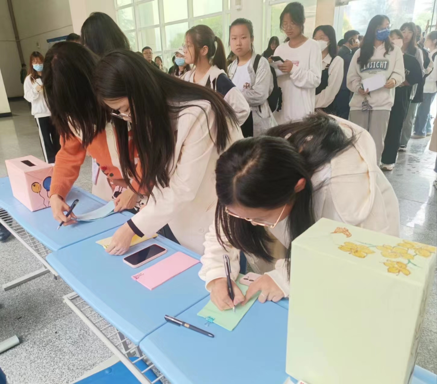 活动中人文学子分别以两种形式进行自我表达,一是将“给未来自己的一封信”或“心灵便签”分别投递到“时光机”和“心灵树洞”两个信箱中抒发心中所想所寄,引导他们正确认识自我、评价自我、关爱自我,将快乐传递、将垃圾清理。二是与可爱玩偶进行一次温暖的拥抱,鼓励学生大胆表达自己的情绪,敞开心扉,善待自己,关爱他人。