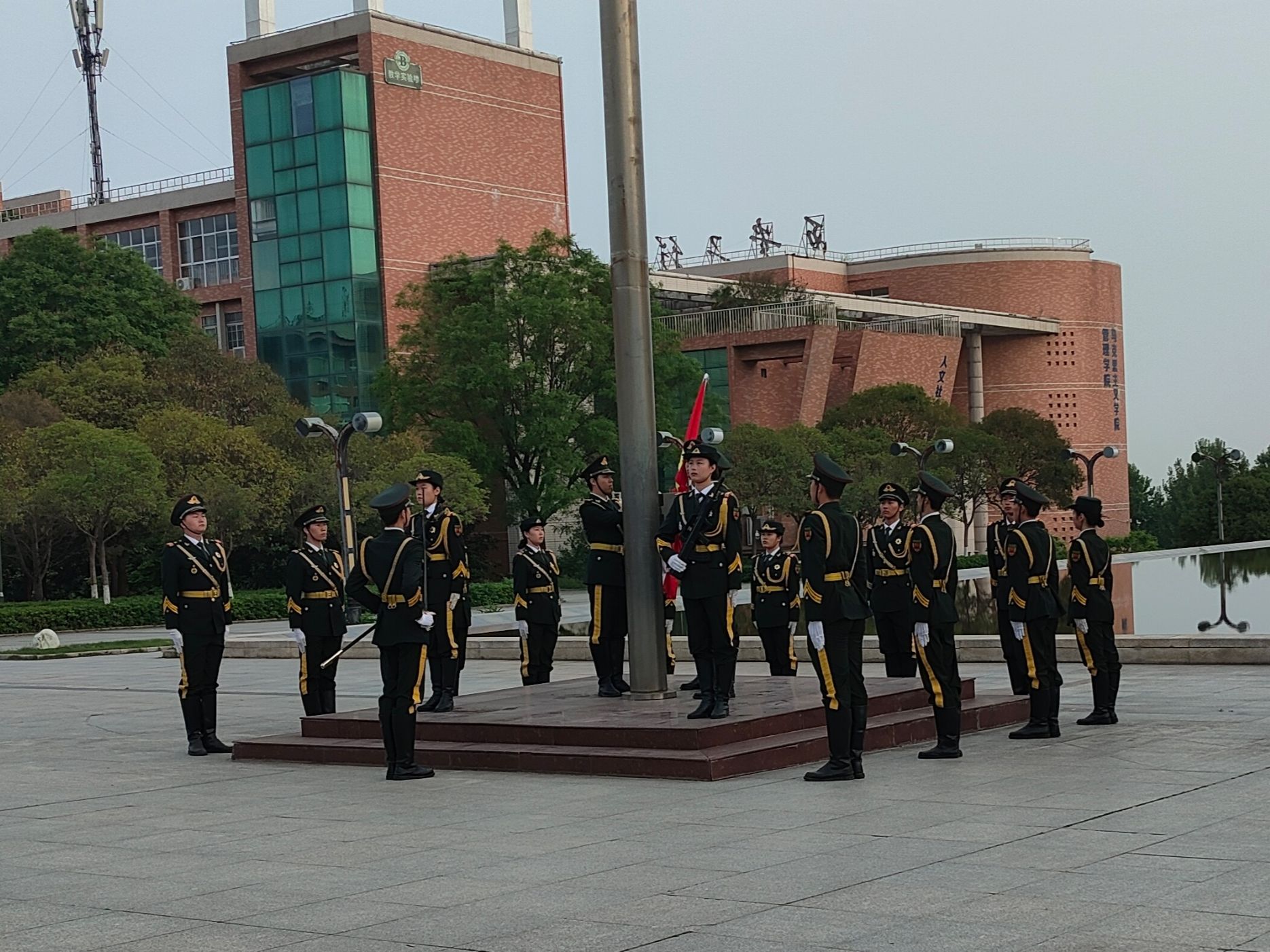 早晨七时整,国旗护卫队队员步伐坚定,昂首挺胸,以挺拔严肃的姿态护卫着国旗。在庄严的国歌声中,五星红旗冉冉升起,迎风飘扬。师生们肃立致敬,行注目礼,表达对祖国的热爱与敬意。