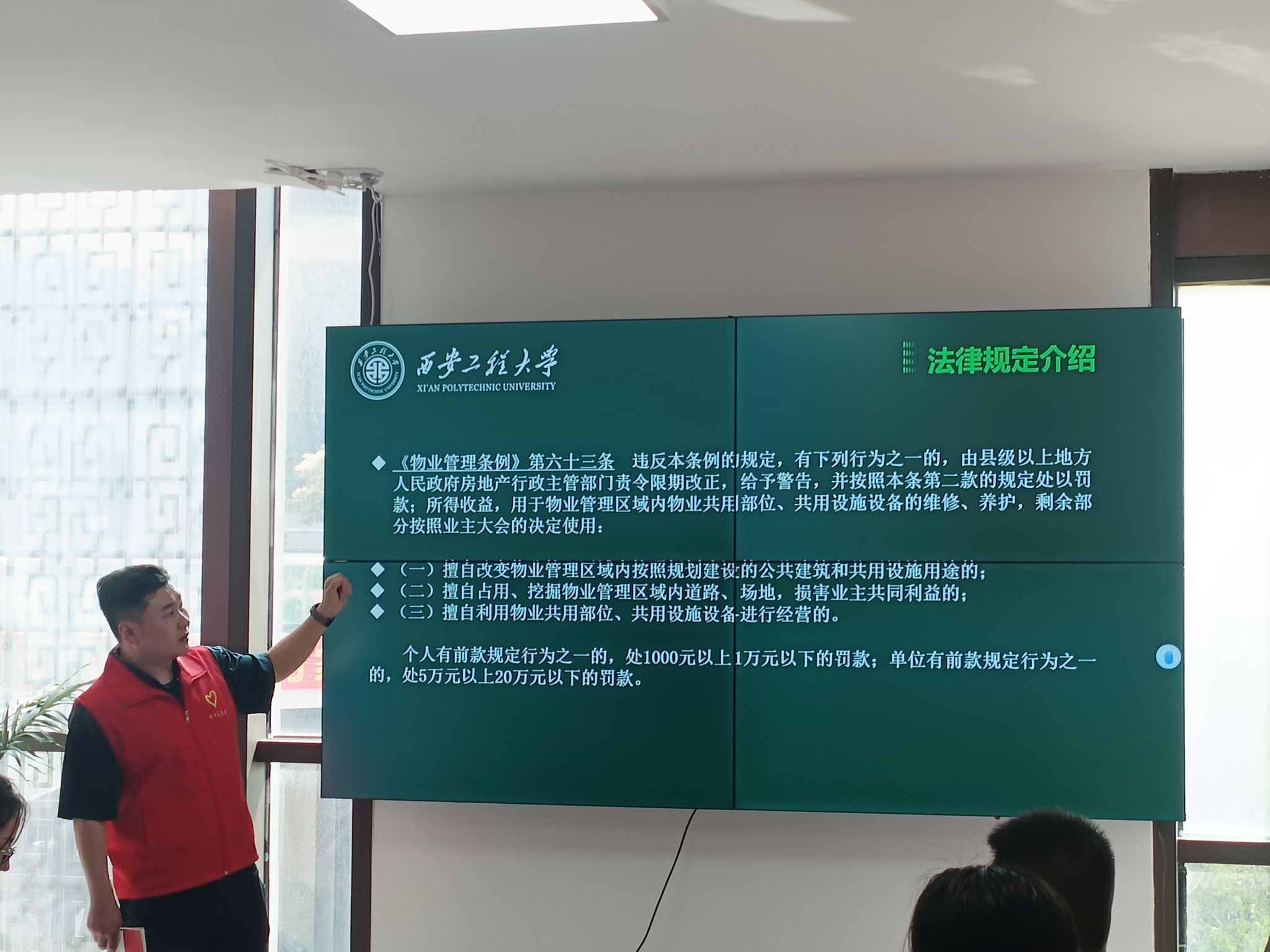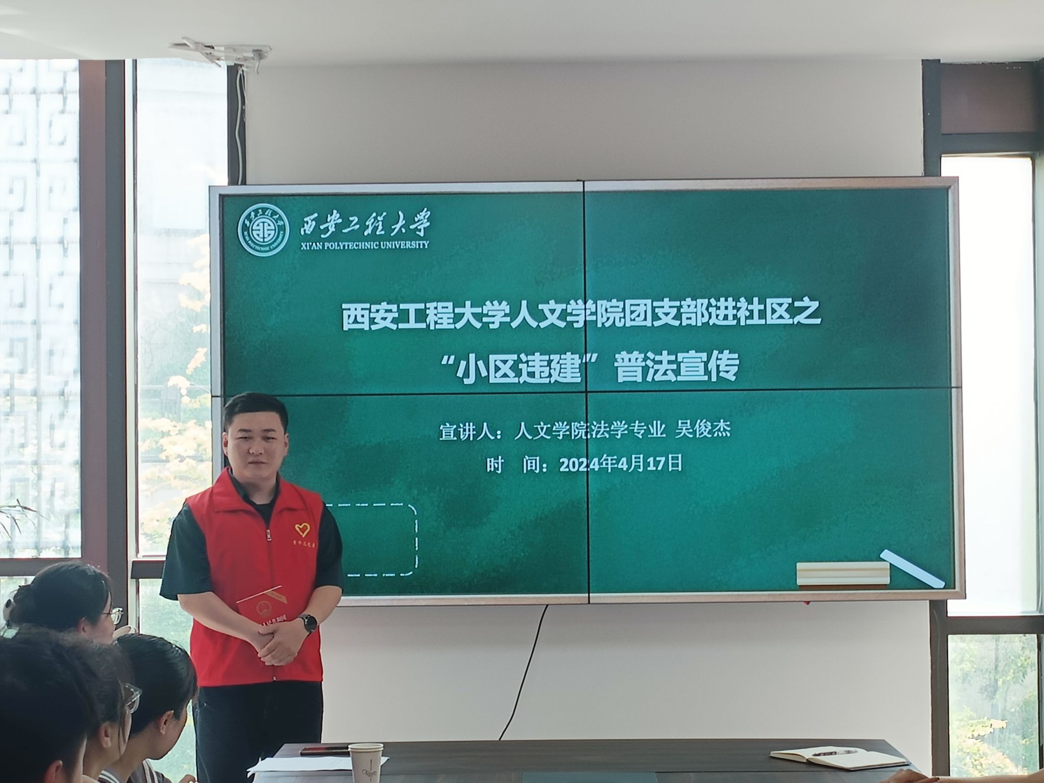 在“4.22”世界法律日到来之际,人文学院团委与临潼区司法局斜口司法所深度合作,深入社区开展“小区违建”普法宣讲活动。让社区群众对小区违建的危害性和法律责任有了更加清晰的认识,提高居民安全意识防微杜渐,将法治知识送到千家万户。以实际行动践行了“奉献、友爱、互助、进步”的志愿者精神,为建设法制社会、平安社区贡献了青春力量!(撰稿:王菲; 审稿:陈莉霞)