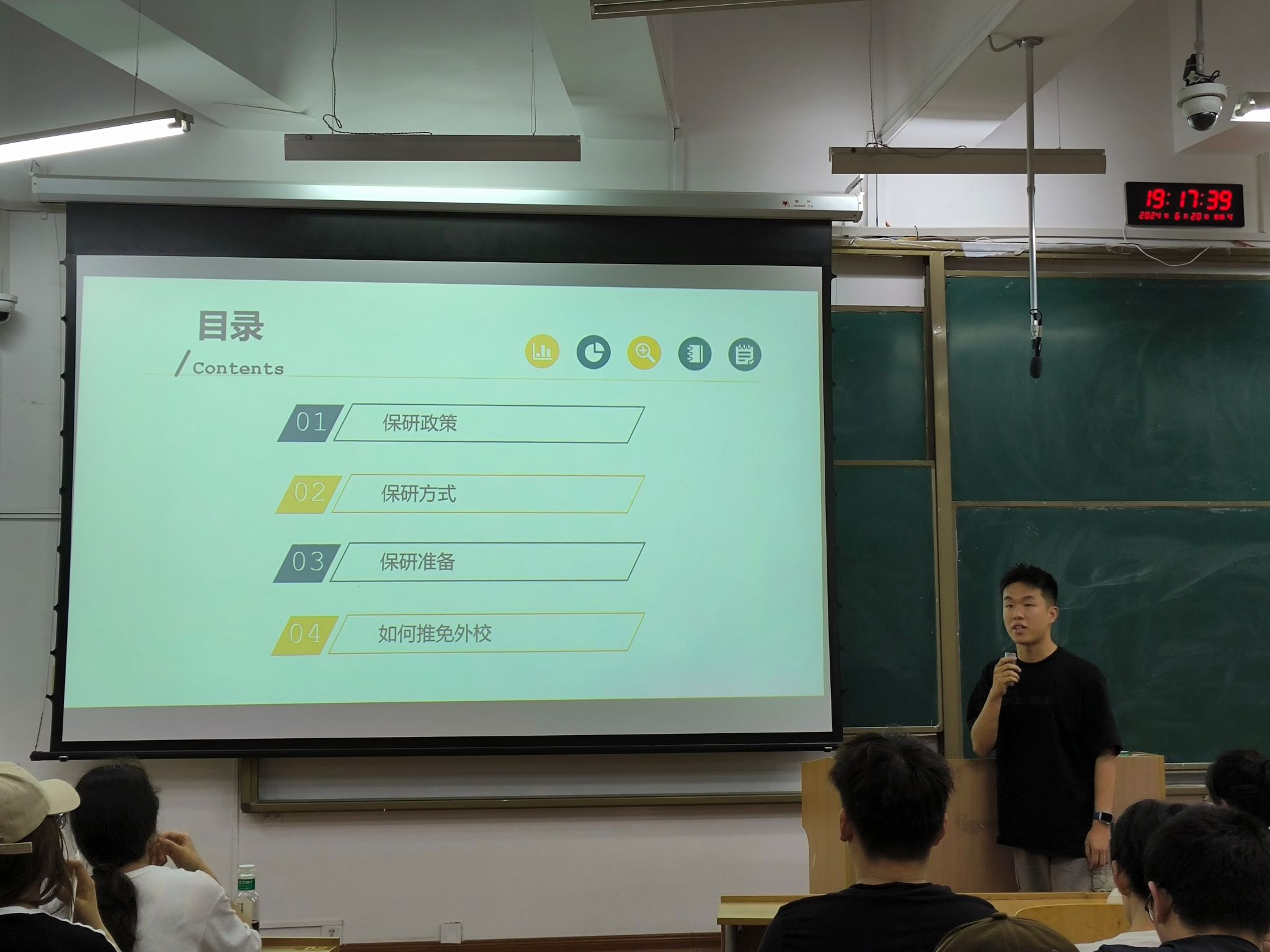 本次分享会特邀2020级成功保研的杨皓宇和尹靖云竹做经验分享。两位学长围绕保研政策、保研方式、信息来源及材料准备等方面展开了分享。杨皓宇详细分享了保研的一系列流程,强调保研需要良好的心态、丰厚的专业知识积累。尹靖云竹则着重说明了材料准备方面,介绍了如何参与科研项目、发表学术论文等,以提升自己在保研竞争中的综合实力。