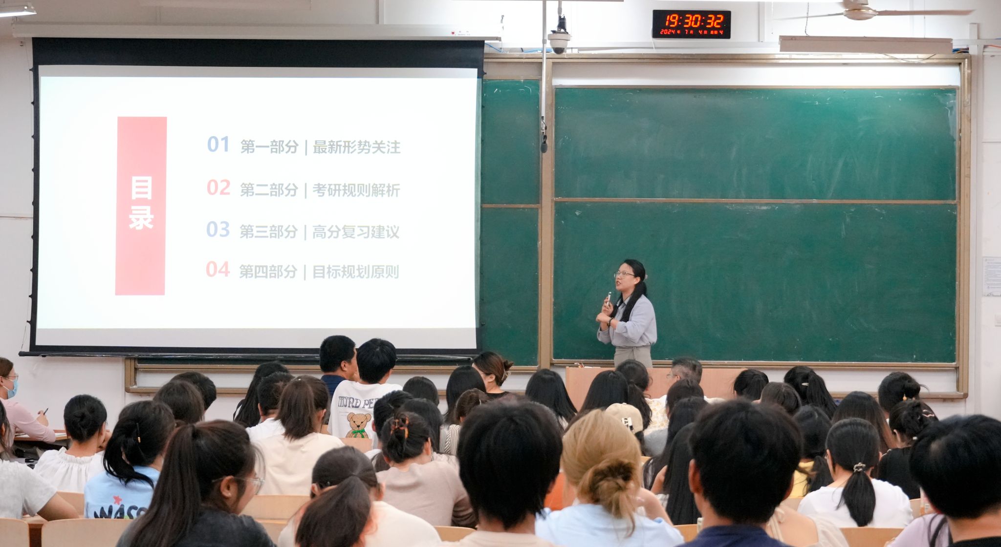 高继英为2026届考研学子详细讲解报考的各个环节,帮助制定高分复习规划。她凭借多年的考研指导经验,结合全国各地的院校分布状况及我校往年的升学数据,针对今年的考试形势予以深入解读和剖析。她详细阐释了考研中 A 区与 B 区的划分标准、学硕与专硕的不同特性,对同学们所学专业进行了数据分析,借由各专业今年划线、进面、录取数据和案例,帮助同学们在选择院校和专业时展开理性分析和科学抉择。