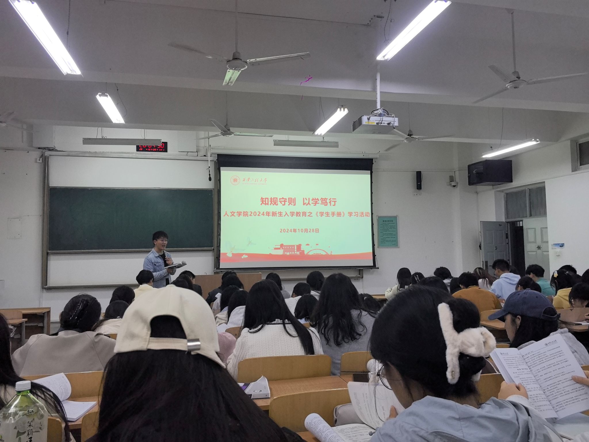 为进一步加强校纪校规教育,帮助学生树立自我约束意识,增强自我管理能力,促进其规范自身行为、养成良好习惯,2024年10月28日晚,人文学院于教学楼A-202开展《学生手册》学习活动。活动由辅导员刘杨扬主持,人文学院2024级全体本科生参与。