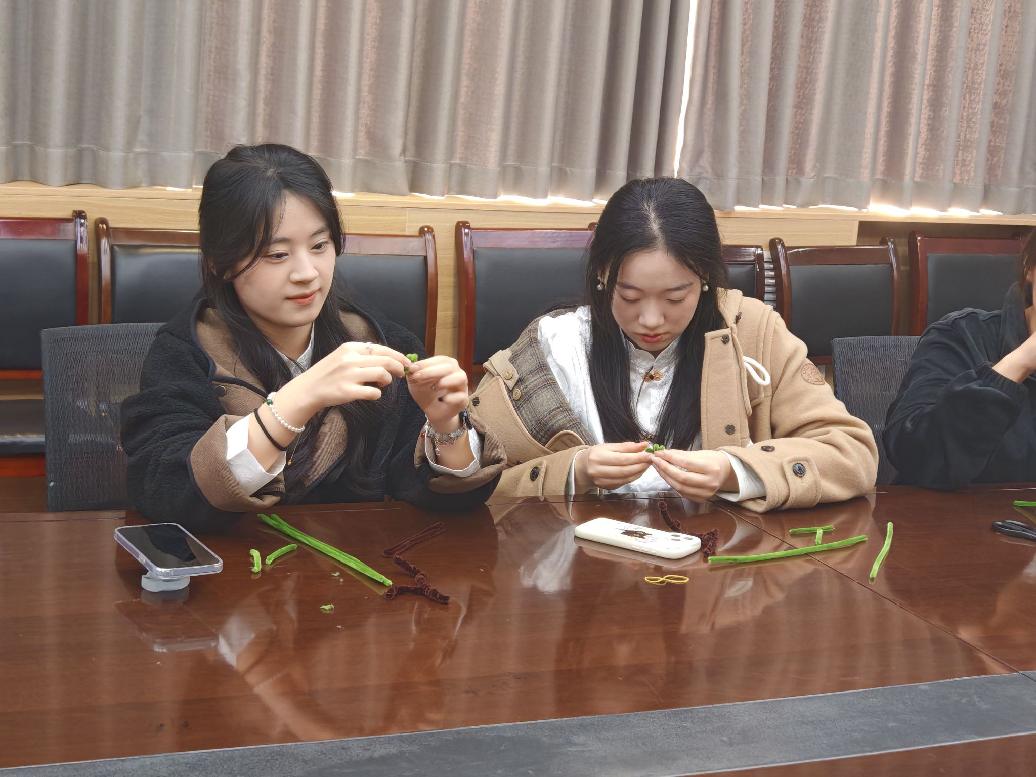 制作过程中,学生们充分发挥想象力和创造力,大家将扭扭棒扭出两种造型,并赋予了它们趣味性的名称。一种造型为松树,起名为“放青松”;另外一种造型为梅花,起名为“梅烦恼”。刘雨彤穿梭在人群中,耐心指导并亲自示范。
