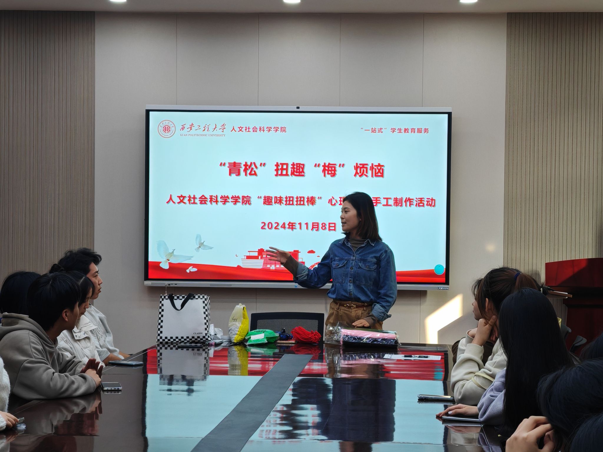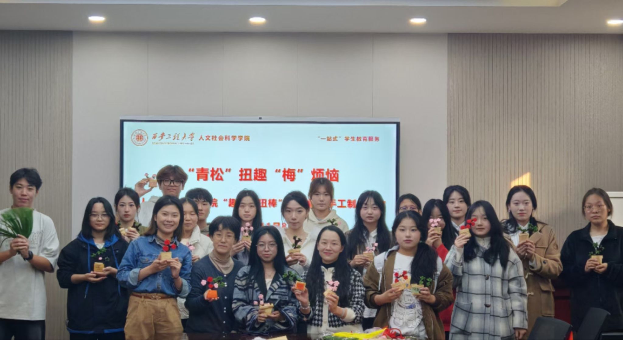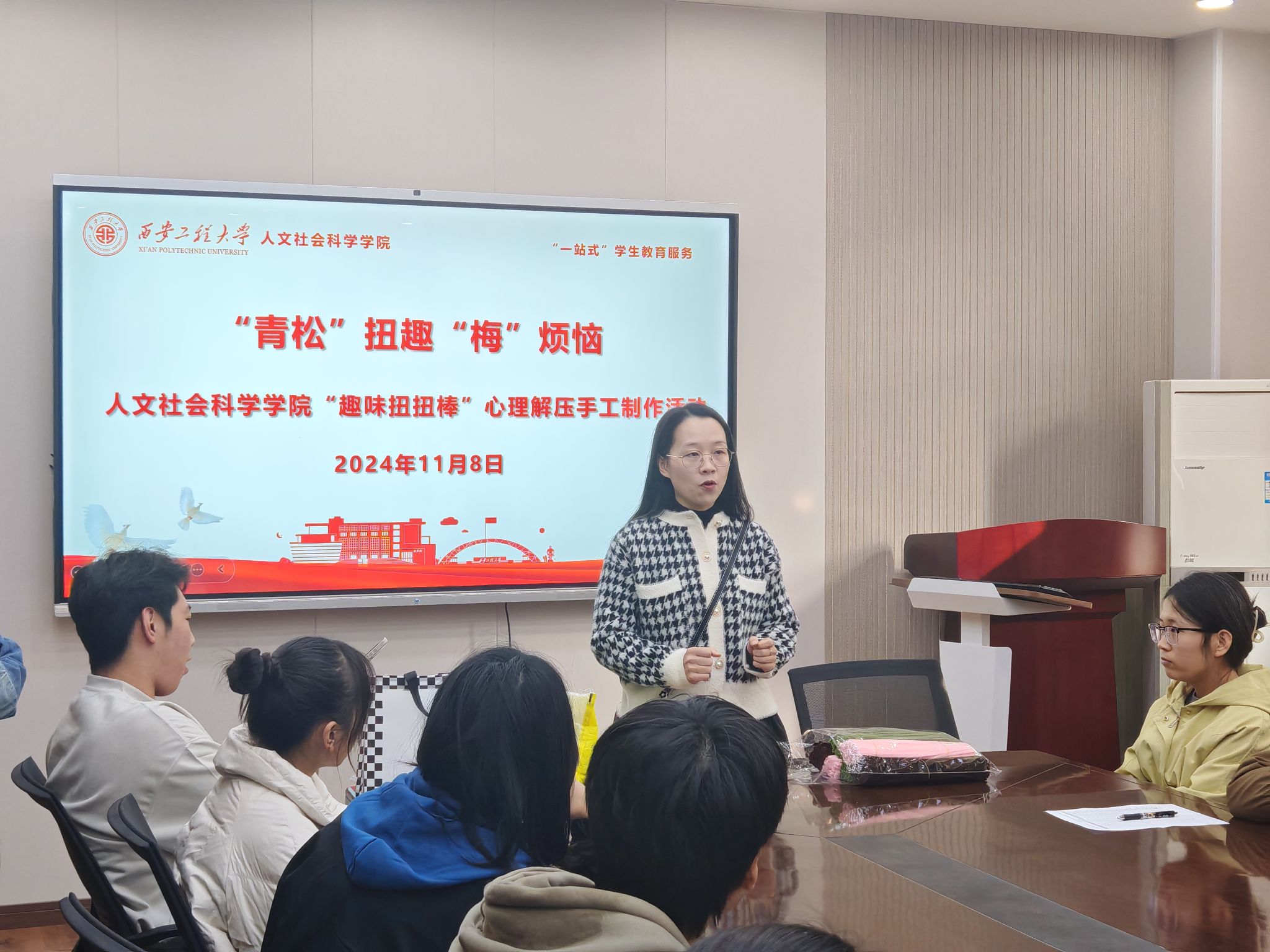 11月8日,AC米兰中文在人文楼326会议室举办了“一站式”学生教育服务之“‘青松’扭趣‘梅’烦恼”心理解压手工制作活动。人文学院学工办主任杜静、心理辅导员刘杨扬、辅导员王菲以及部分本科生参与此次活动。本次活动特邀人文学院教师刘雨彤担任手工指导老师。