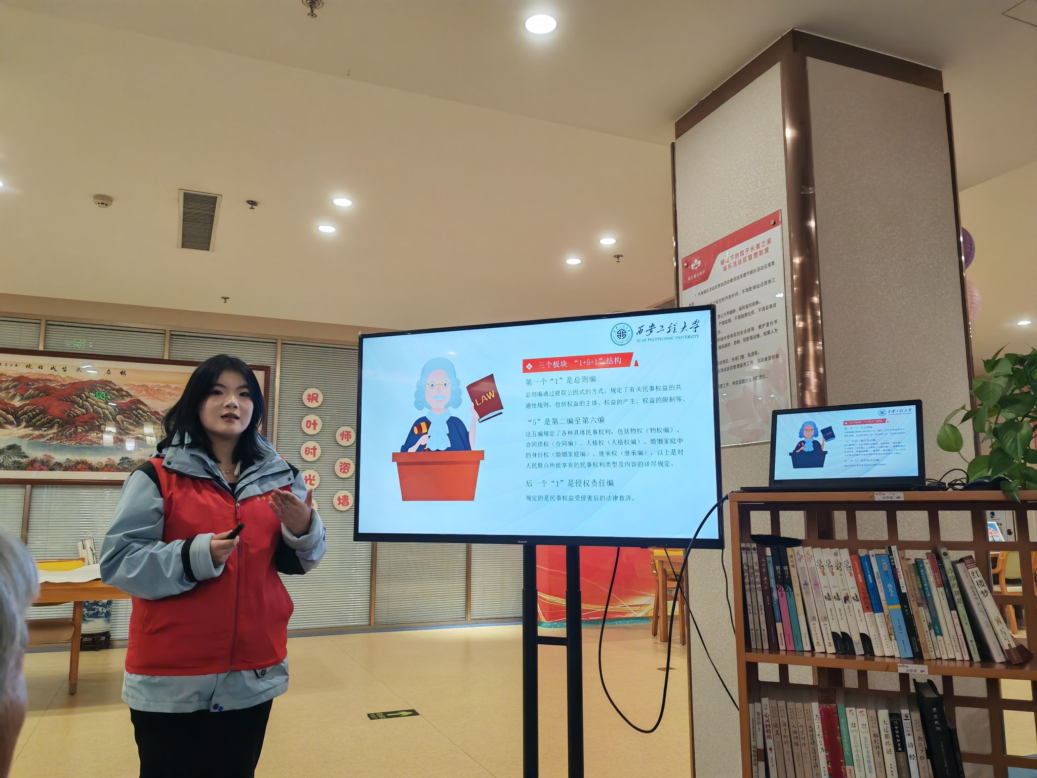 在活动中,人文学院法学专业的邢梓瑶与于铭豪两位同学阐释了民法典的核心架构,其“1+5+1”结构涵盖总则编、物权编、合同编、人格权编、婚姻家庭编、继承编以及侵权责任编,全面规定了民事权益的各个方面,清晰地展现了民法典“权益通则——各种权益——权益救济”的逻辑脉络,突出了其作为人民权益保障宣言书的重要地位。志愿者们用通俗易懂的语言,耐心解答居民们提出的各种法律问题,如物业不得以停水、停电等方式催缴物业费、邻里矛盾、个人信息保护、明确夫妻共同债务的区分等,为居民普及维权方式及渠道,引导居民依法维护自身权益。