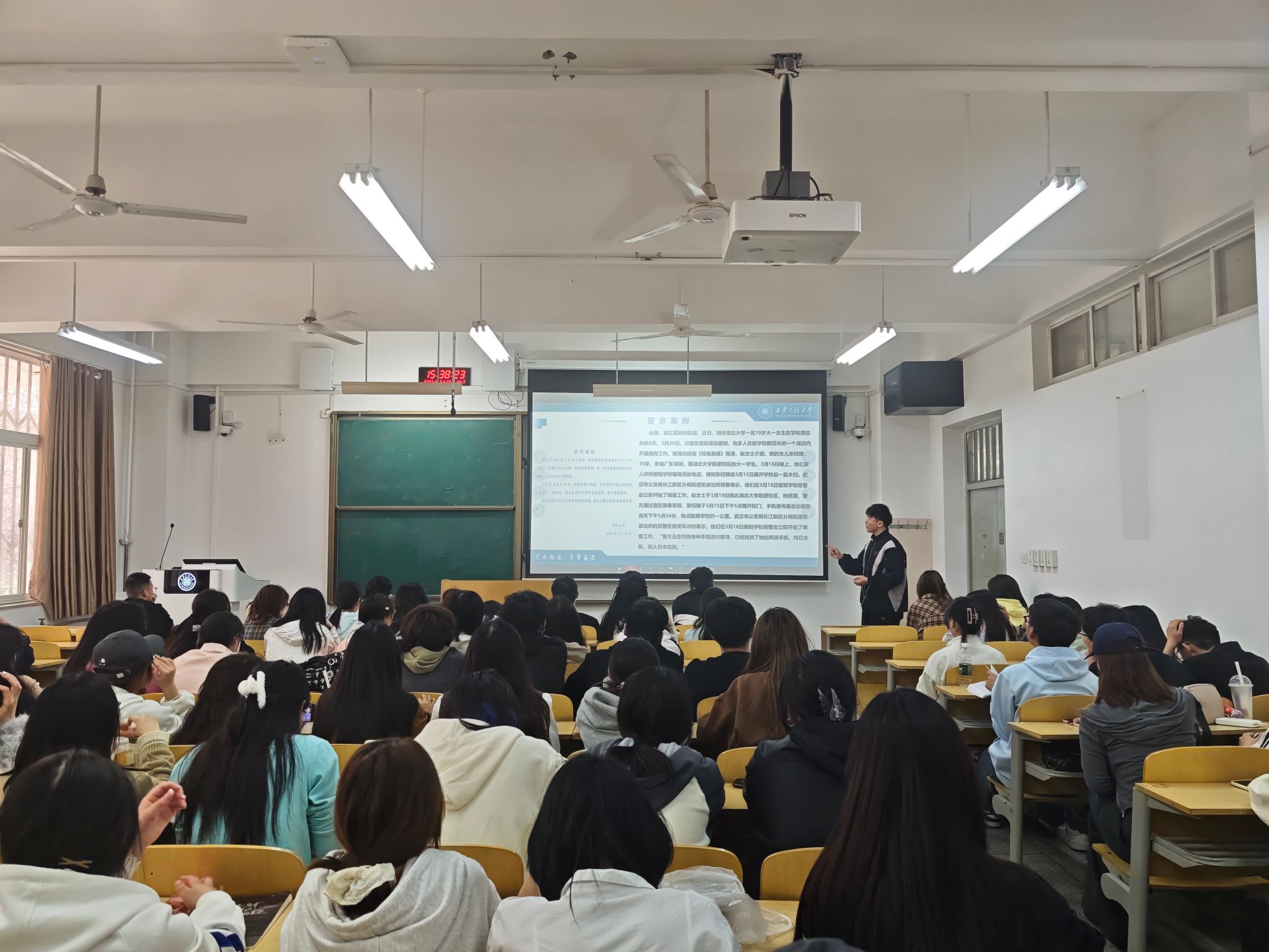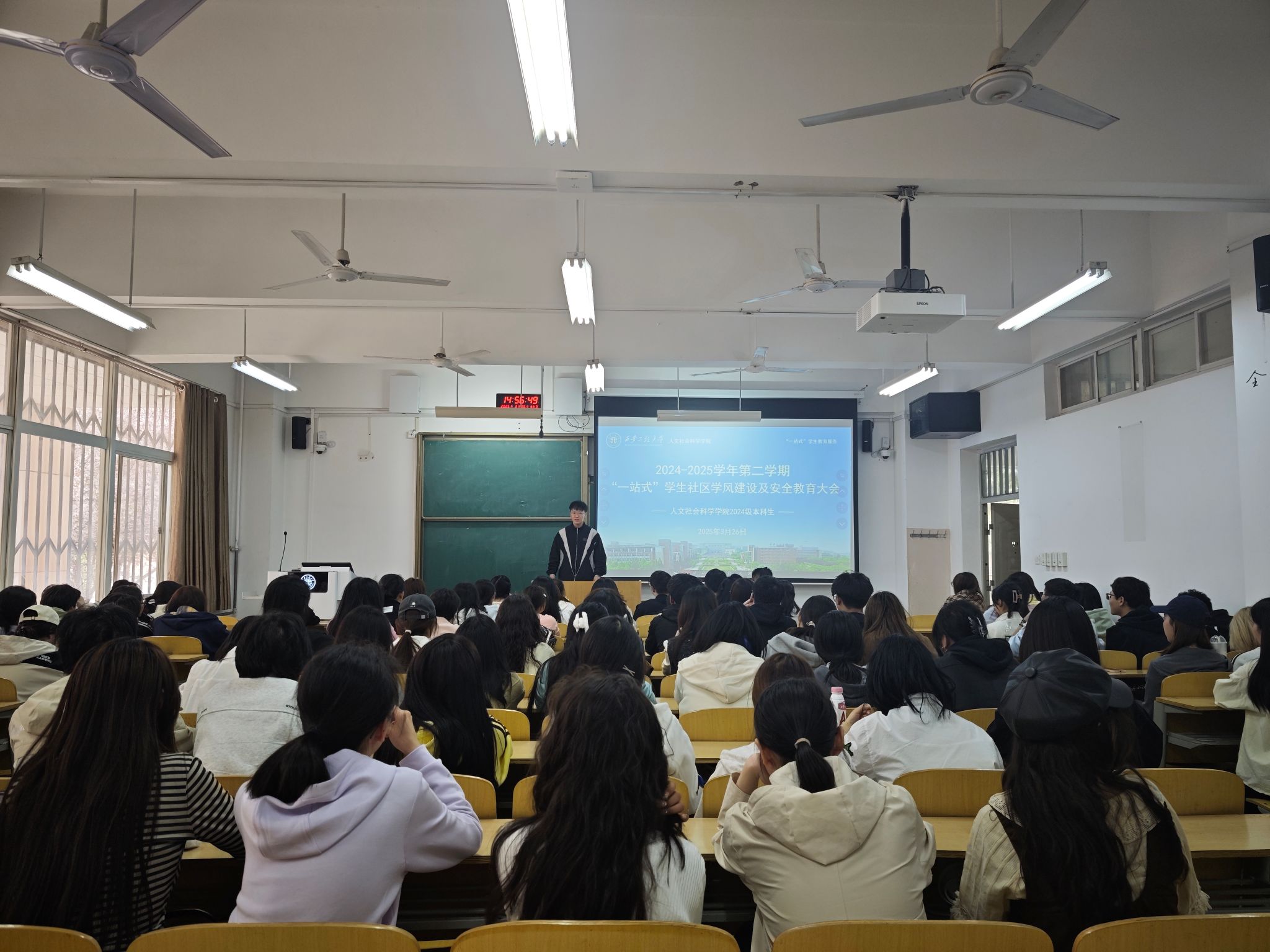 为进一步引导学生传承科学家精神和教育家精神,推动学风建设向纵深发展,同时筑牢校园安全防线,促进学生身心健康与学业进步,人文学院于3月26日在教学楼D-186召开了2024级年级大会。此次活动由学院团委书记、2024级辅导员刘杨扬主持,2024级全体学生参与。