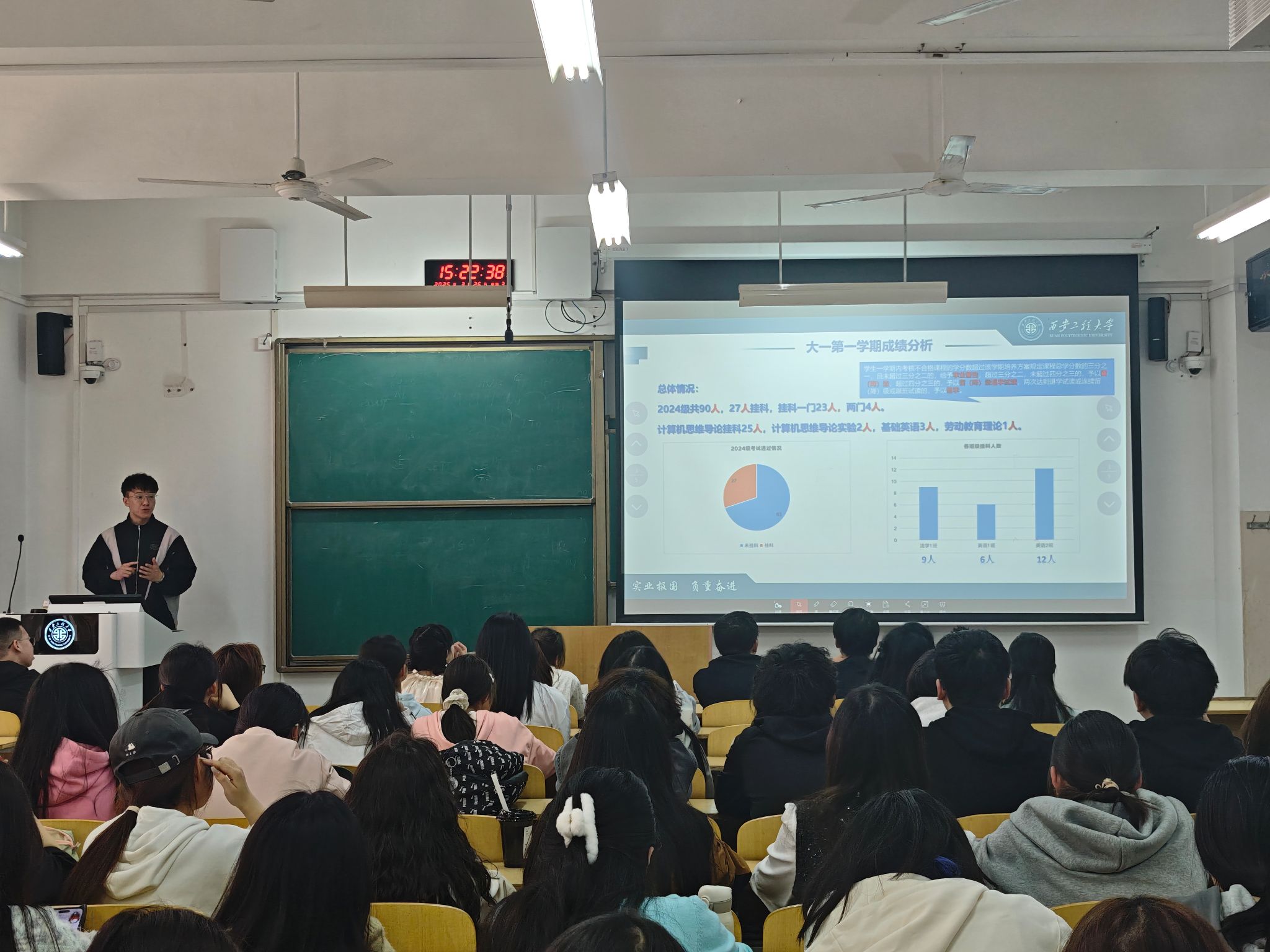 学风建设方面,刘杨扬结合学生大一第一学期的成绩数据,深入分析其学科表现,聚焦部分课程薄弱环节,帮助学生明确提升方向。通过数据对比与问题剖析,引导学生发现自身学习中的不足,并鼓励他们优化学习方法,培育优良学风,为未来的学业发展奠定坚实基础。