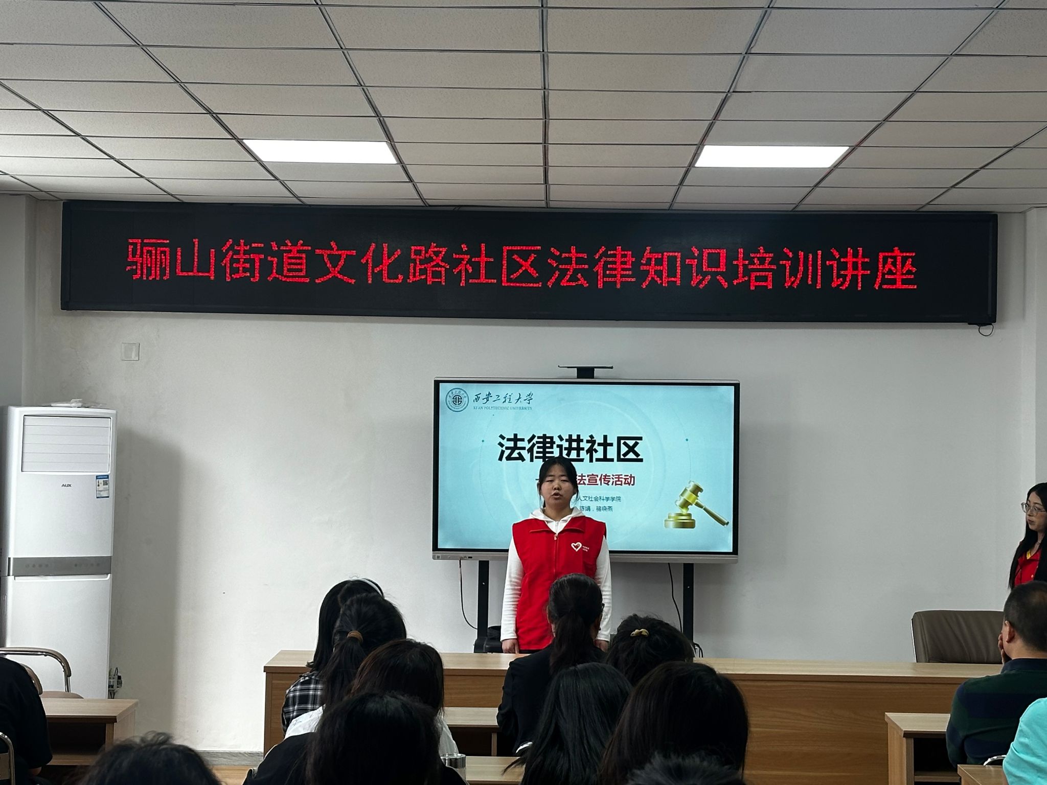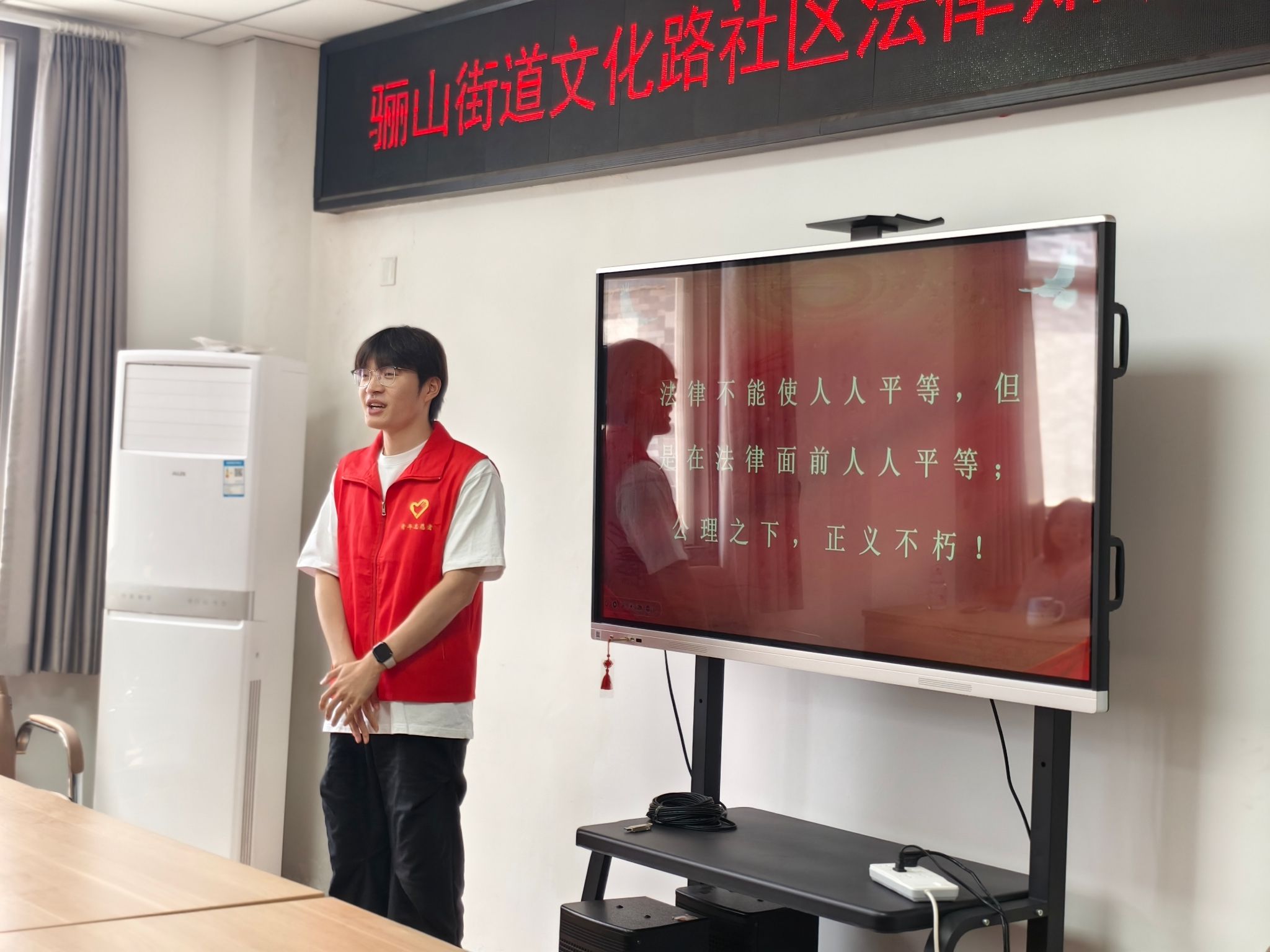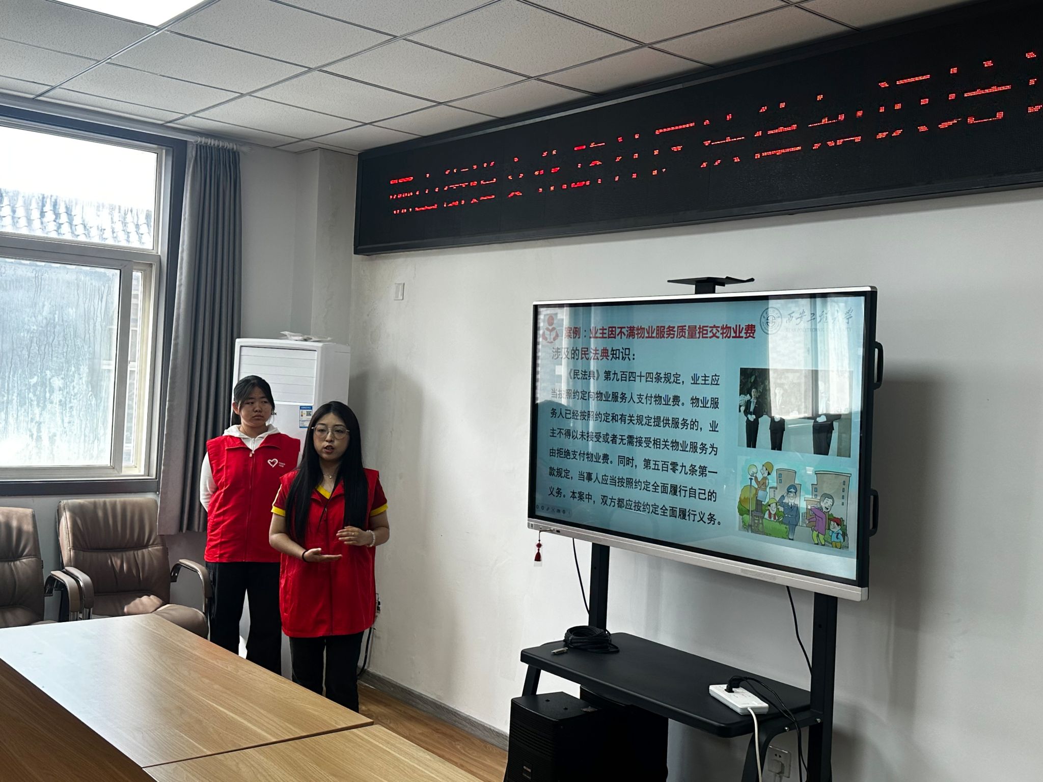 4月23日上午,学院2022级法学专业学生、骊山街道文化路社区挂职团支部副书记李自辉组织学院志愿者在临潼区文化路社区开展“法律进社区” 法律知识宣讲活动。此次活动聚焦《民法典》中物业相关内容以及《刑法》中与居民生活较为密切的法条进行讲解,为居民带来一场全面且实用的法律知识讲座。校团委副书记凌旭、文化路社区主任赵荣及社区物业代表、居民代表参加讲座。