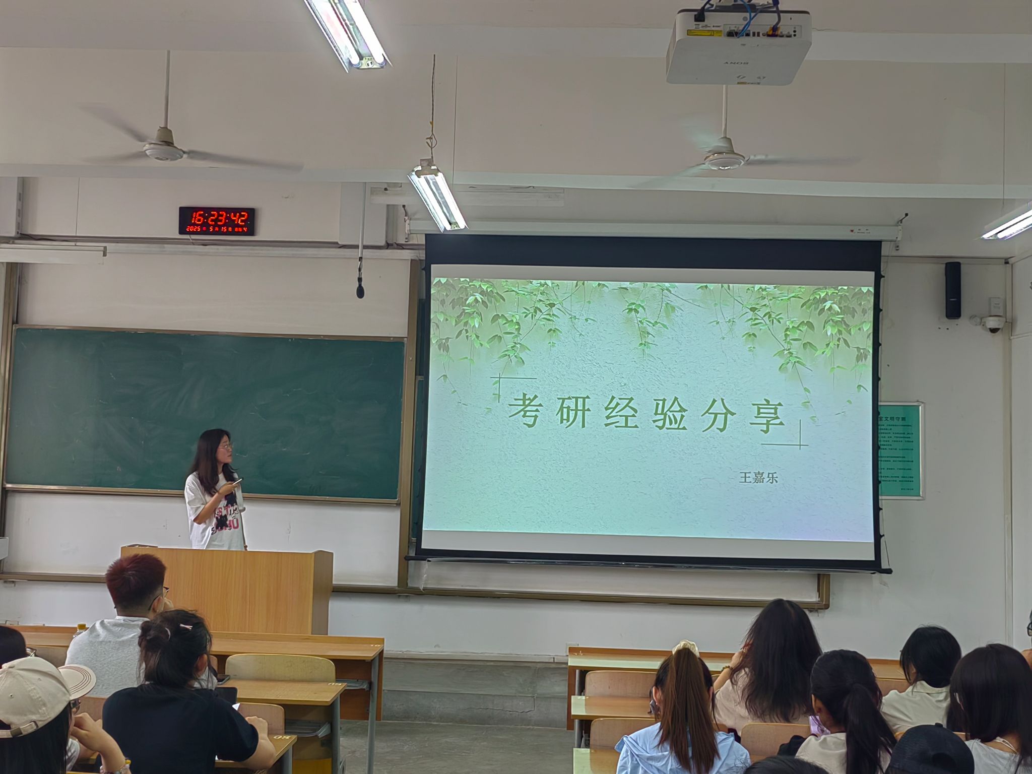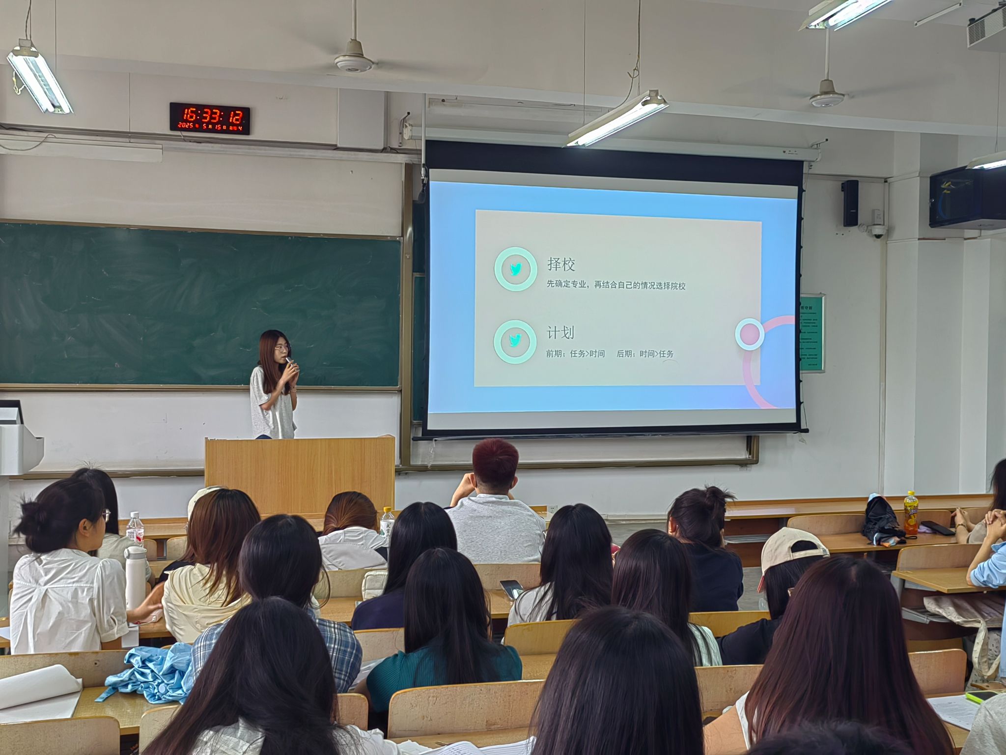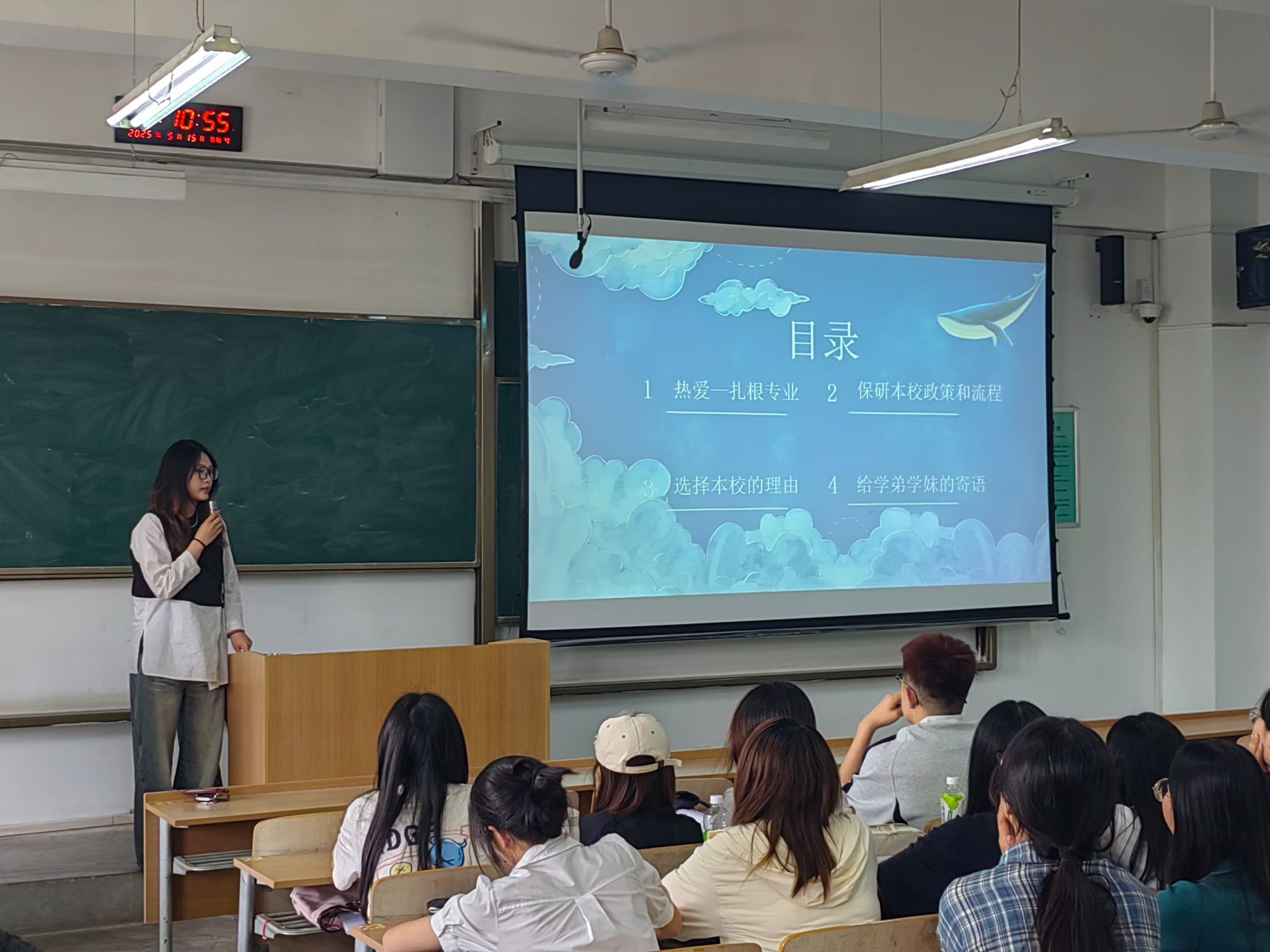 活动开始,刘杨扬简要介绍了学院近年来考研趋势,全面分析了2025届的考研情况,并从报考学校及专业选择、选考类型、个人职业规划等方面提出意见和建议。随后,由四位2025届保研、考研成功上岸的优秀学子一一进行经验分享,为参会同学们提供了学习方向和时间规划策略,分享了相关学习资料与个人总结,给同学们详细讲述了保研、跨专业考研等相关流程与备考方向。互动环节中,同学们积极提问,与学姐们进行了深入的交流。无论是关于保研院校的选择,还是考研准备时间的分配,学姐们都耐心地一一解答,同学们受益匪浅。