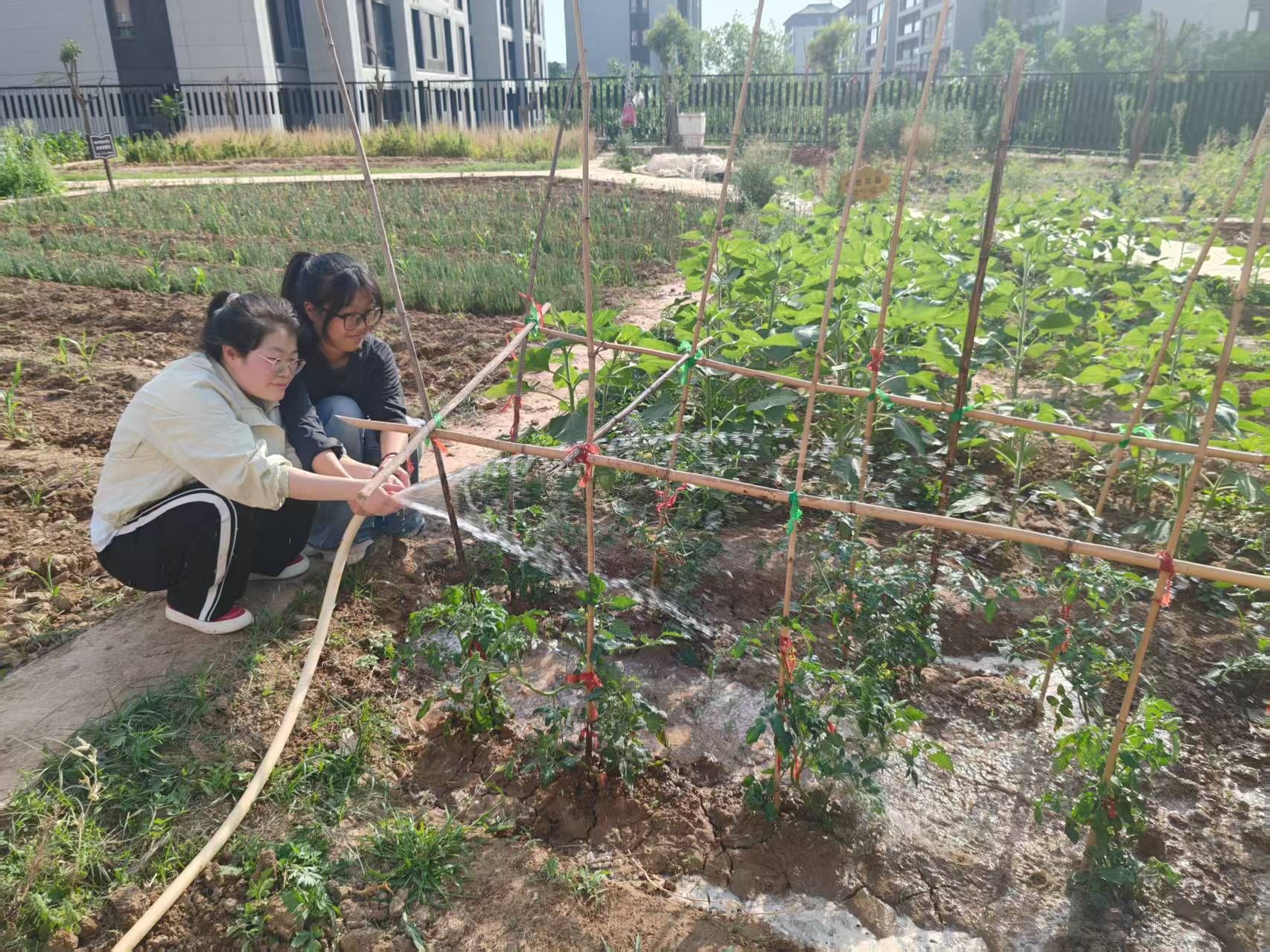 小满时节,师生们在指导师傅的指导下开启“播种三部曲”。师傅首先示范整地要领,讲解“深锄保墒”的方法,手把手指导同学使用锄头进行土地平整。在播种环节,师生分组开展玉米点种与黄瓜点种:大家严格遵循“浅穴薄覆”原则,精准控制合理株距。劳作过程中,同学们自发组成互助小组,对缺苗断垄区域进行补栽,采用平铺的浇灌方式为新苗补水。从生涩到娴熟,师生们额头沁出的汗珠与沾满泥土的双手,在初夏的阳光下折射出劳动教育的生动注脚。