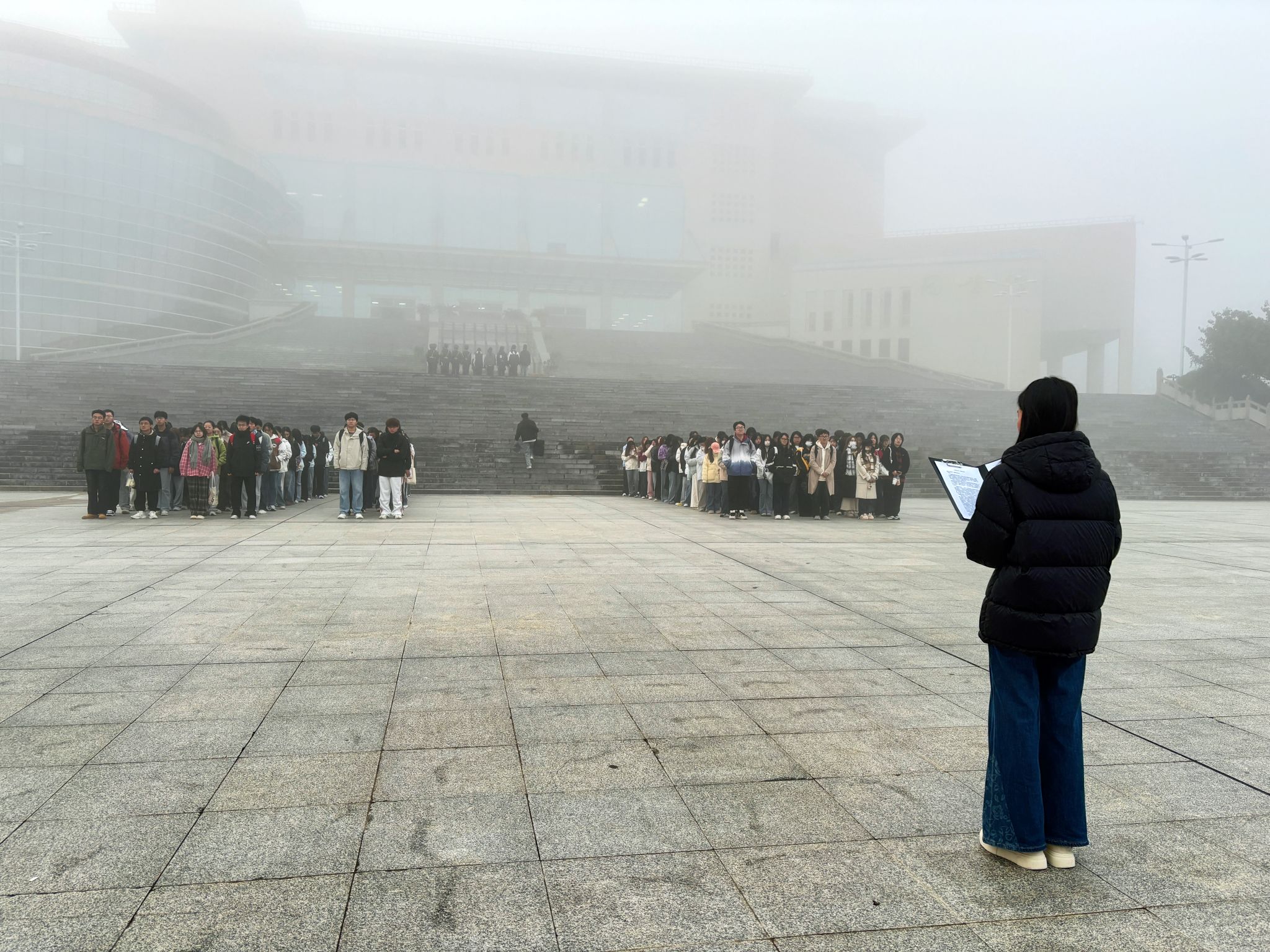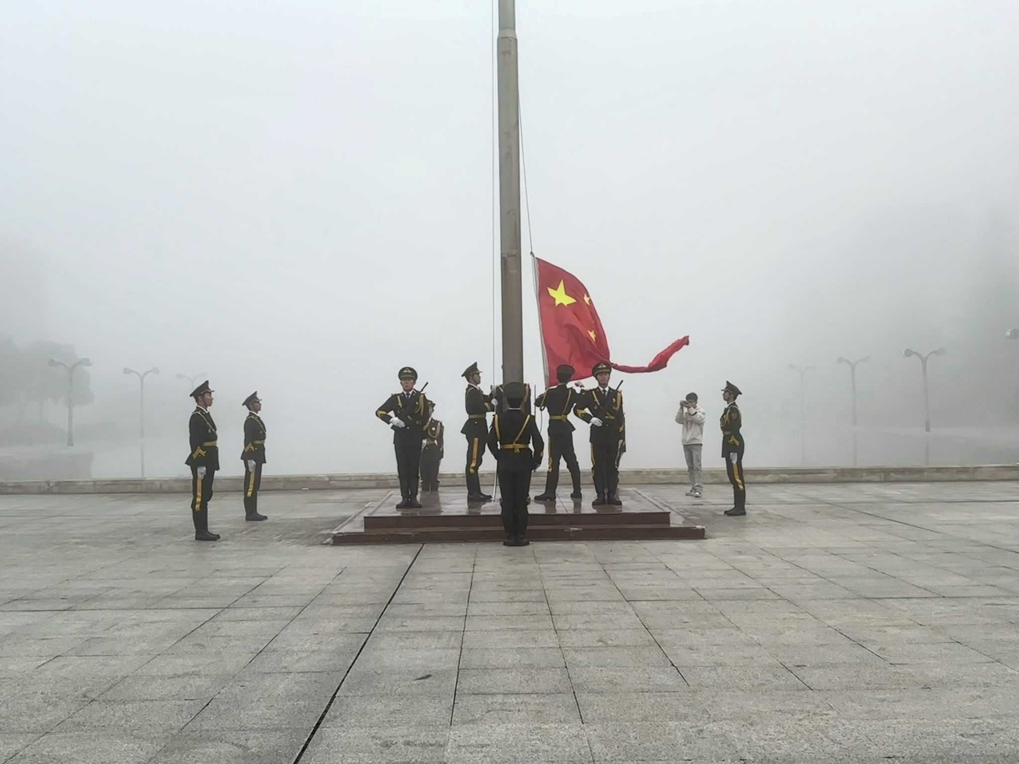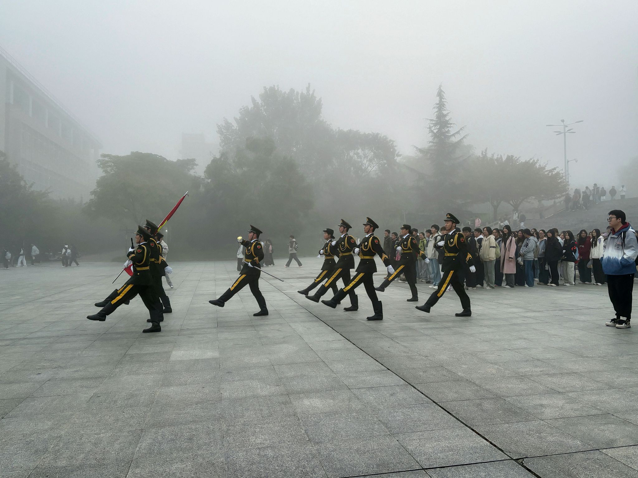 清晨薄雾中,参与升旗的人员准备就绪,国旗护卫队队员迈着整齐的步伐护送国旗入场。伴随着庄严的国歌,五星红旗穿透薄雾冉冉升起,全体学生怀着自豪与崇敬的心情,凝视着雾气中愈发鲜艳的国旗。随后,2025级英语2班张涵玉进行国旗下演讲,以“以青春之我,筑强国之基”为主题,结合青年责任与时代使命,号召在场学生将个人成长融入国家发展进程,以奋斗姿态践行时代责任。五星红旗迎风飘扬,现场响起热烈掌声,此次升旗仪式落下帷幕。