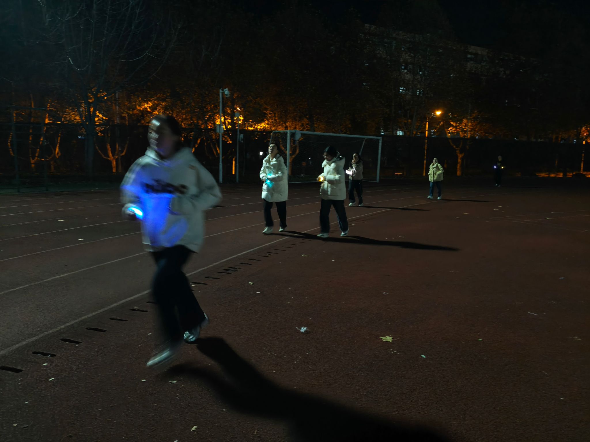 热身结束后,“荧光夜跑”正式开启。本次夜跑以田径场400米环线为固定路线,参与人员或结伴行进、或独立参与,荧光手环随步伐跃动,整场活动持续近30分钟,最终有序结束。
