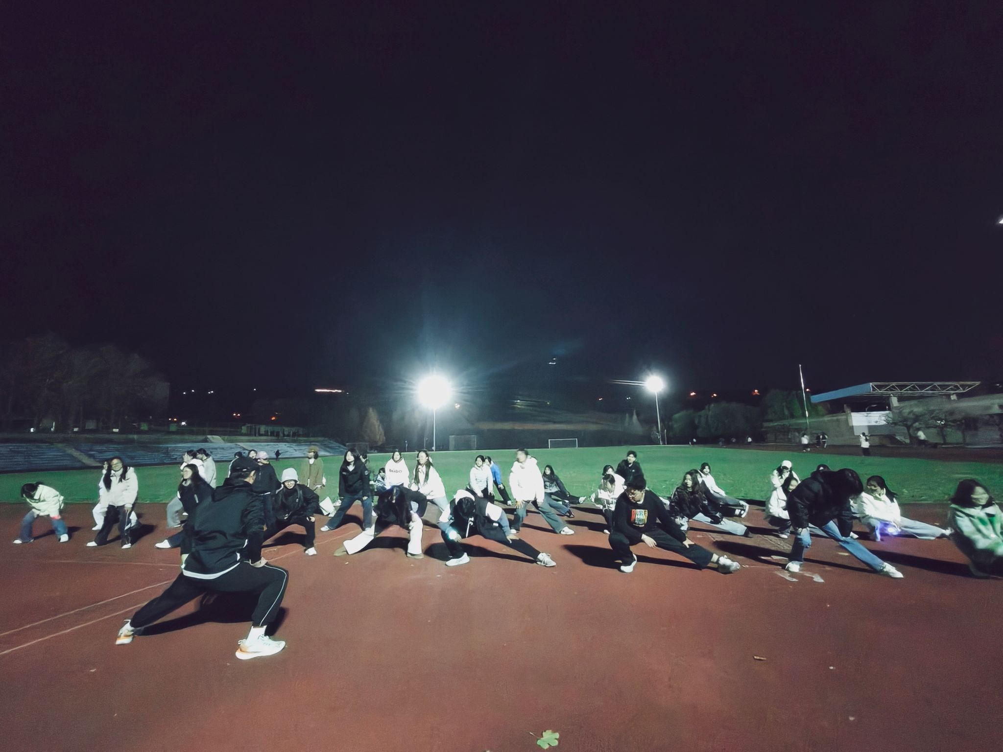 随后,刘杨扬老师带领全体同学开展热身训练:从手腕、脚踝的关节环绕,到扩胸、弓步的深度拉伸,再到高抬腿、开合跳等节奏型动作,每一项训练均讲解细致,确保参与人员充分活动身体、规避运动损伤,现场节奏有序,为夜跑做好准备。