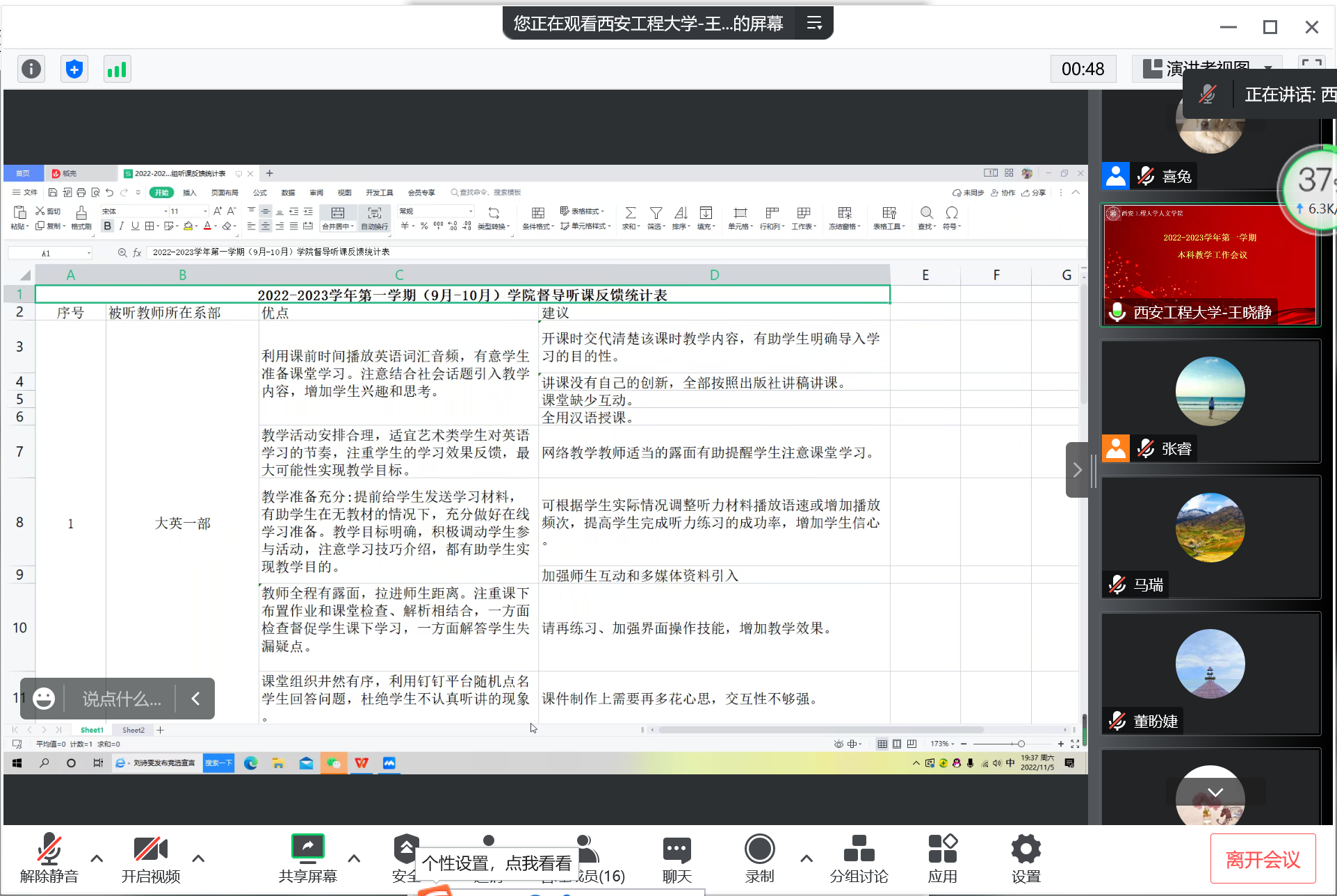 首先,王晓静副院长根据学院督导组本学期9-10月份的听课反馈意见,以系部为单位,从课堂教学的优点、缺点两个方面,将反馈结果向大家一一做了通报,以此让各系部负责人对本系部开学以来的教学现状有一个清楚的掌握。其次,她向大家汇报了我院将要举办第一届教案、讲稿大赛的计划,号召各系部主任做好动员,鼓励学院一线教师积极参加。最后,她将我院2022年目标绩效考核任务及完成情况向大家作以通报说明,并对法学辅修专业相关工作进行了详细的安排部署。