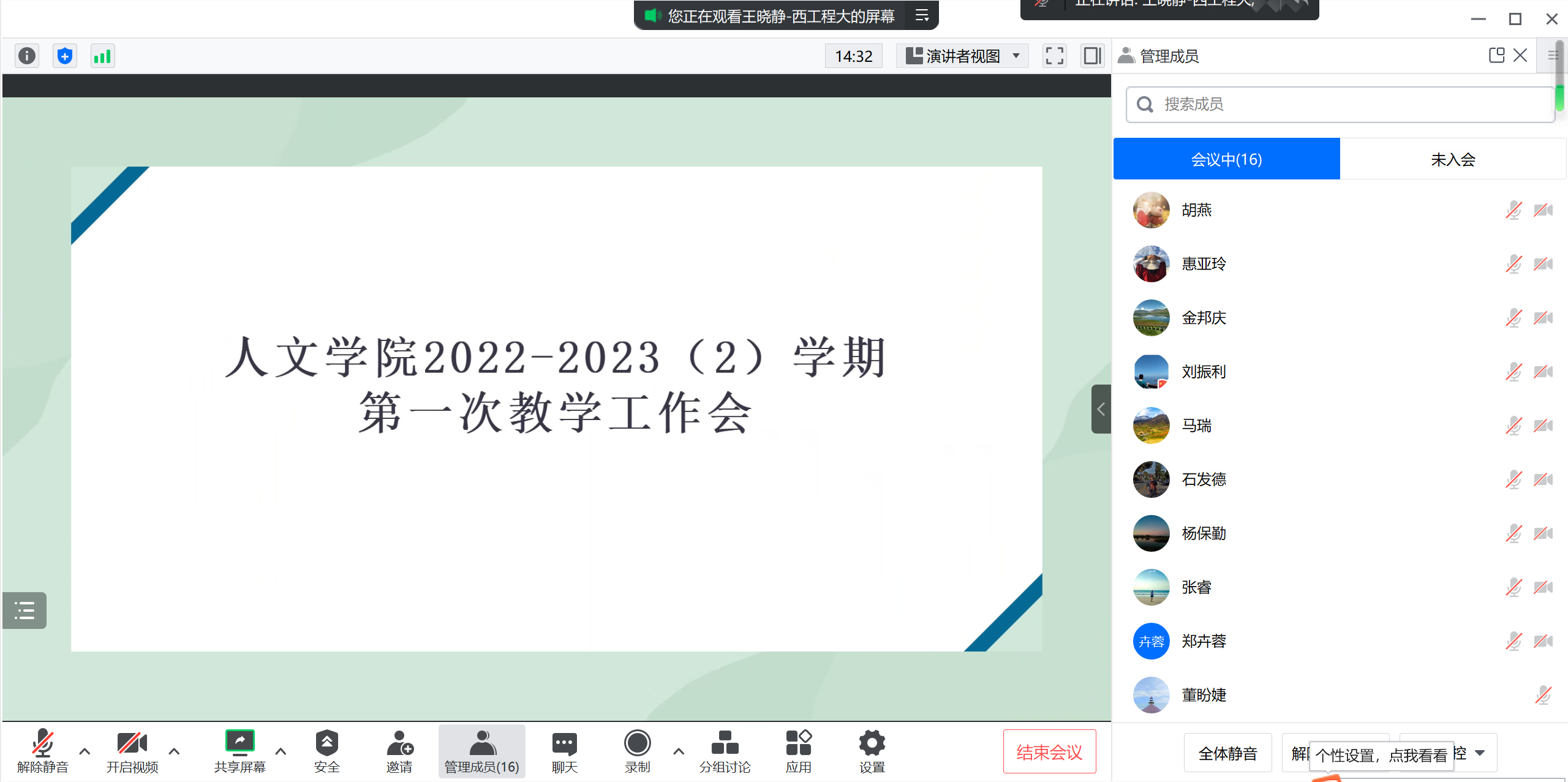 为进一步做好新学期各项教学工作,2月24日下午,我院召开了本学期第一次本科教学线上工作会。副院长王晓静,各系部主任、副主任,教务员秦辰钰参加本次会议,会议由王晓静主持。