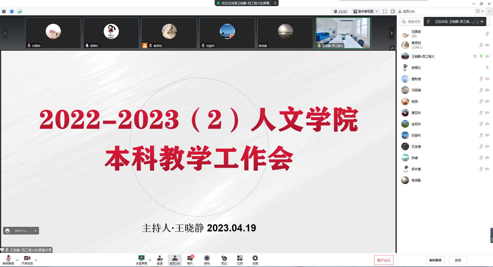 4月19日中午,我院在线上召开了2022-2023春季学期本科期中教学工作会。副院长王晓静、各系部主任、副主任及教务员秦辰钰参加本次会议,会议由王晓静主持。